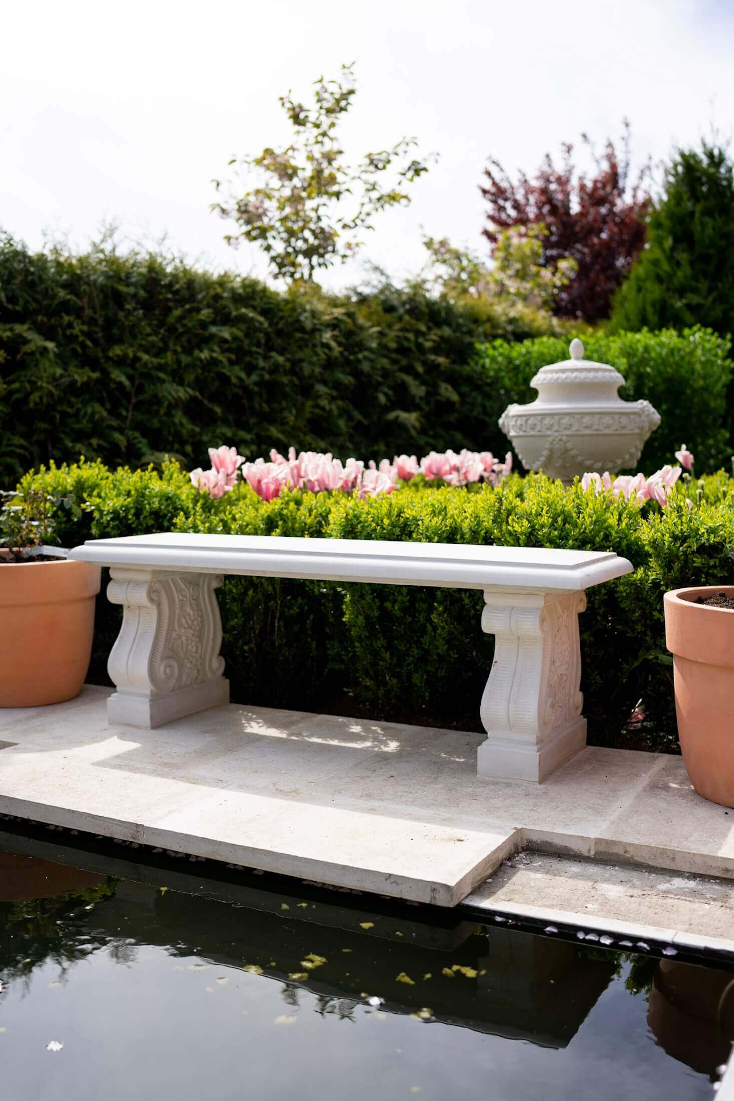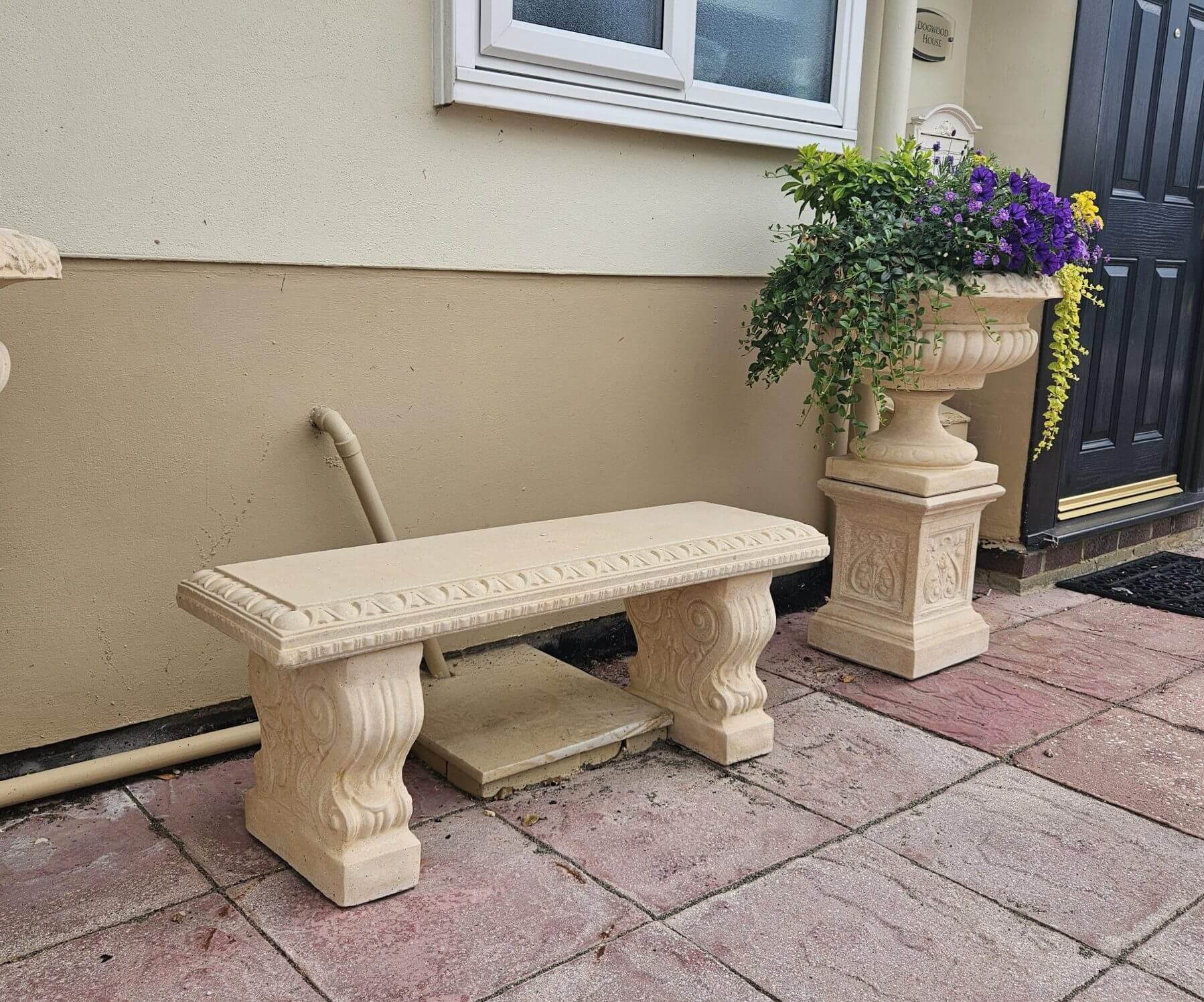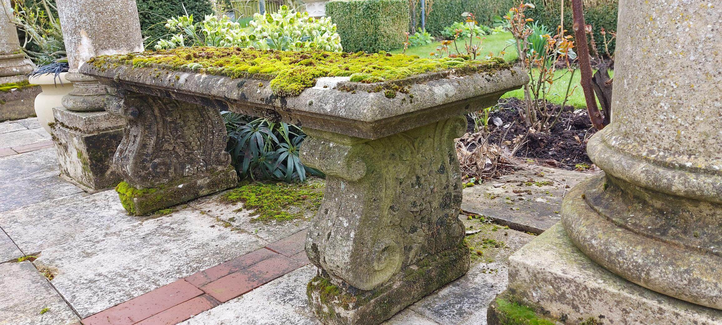 Tato jednoduchá, ale stylová lavice z umělého kamene je tvořena dvěma volutovými podstavci. Její instalace je velice snadná.