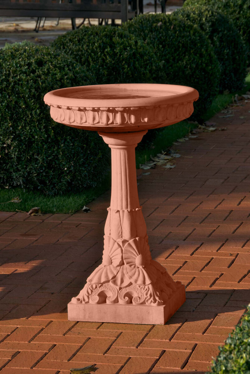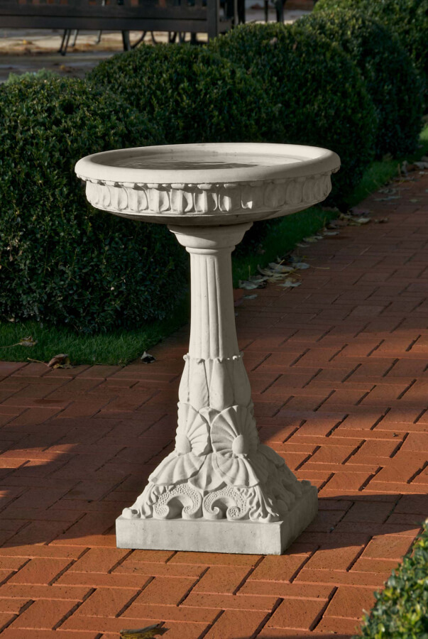 Toto ptačí pítko, ve viktoriánském stylu, z umělého kamene, se zdobnými detaily mušlí na podstavci vytvoří poutavou dekoraci na Vaší zahradě či terase.