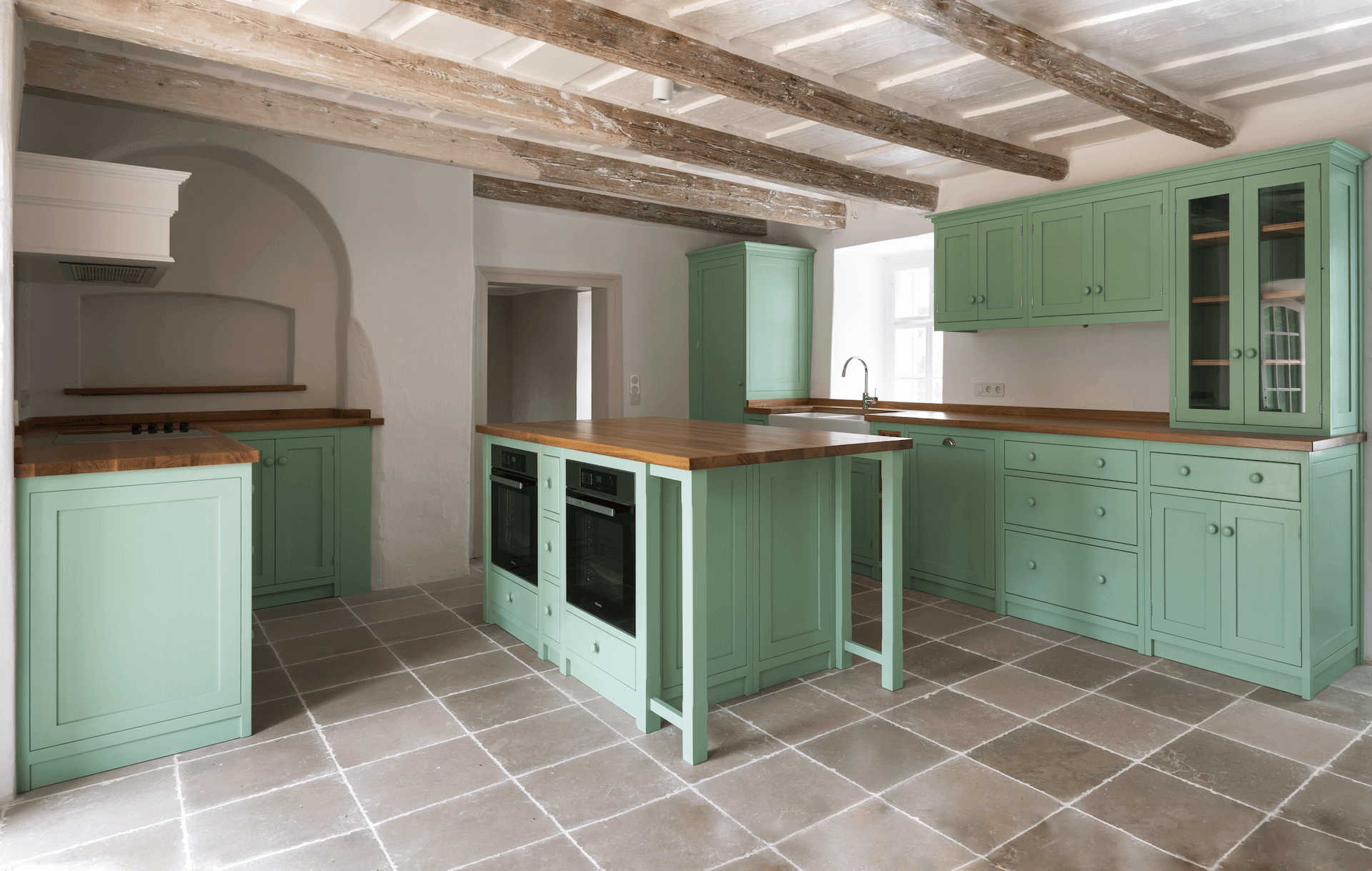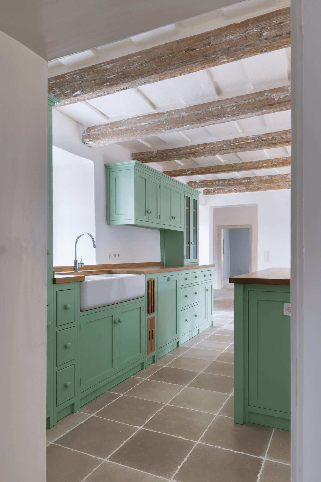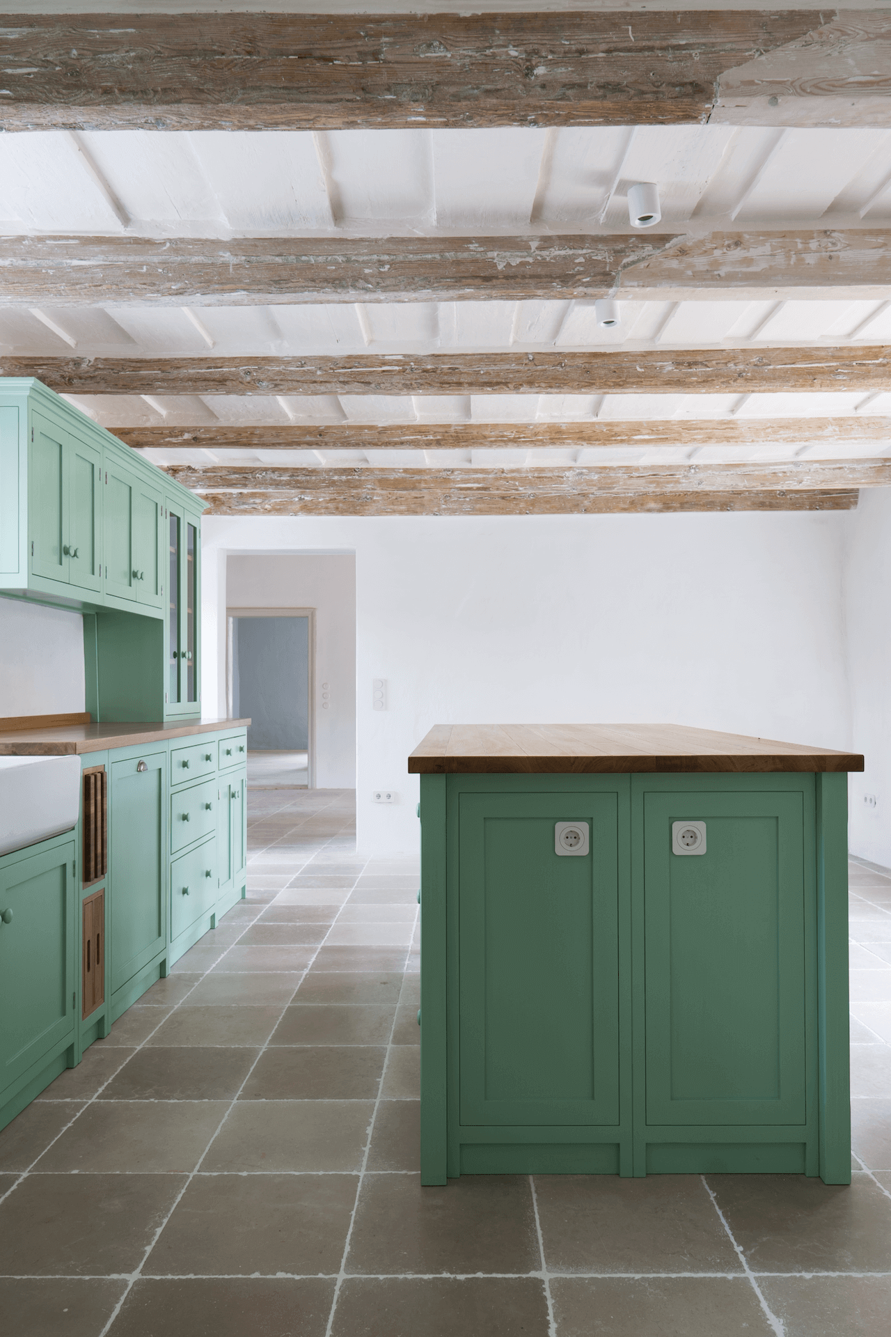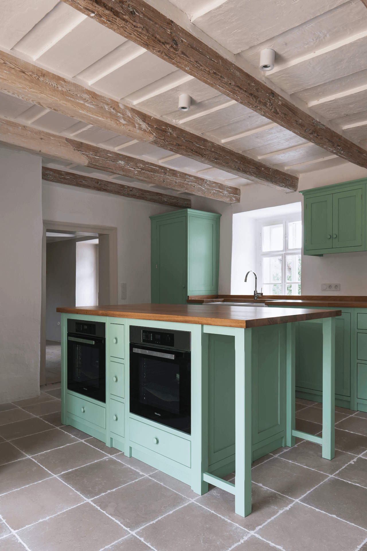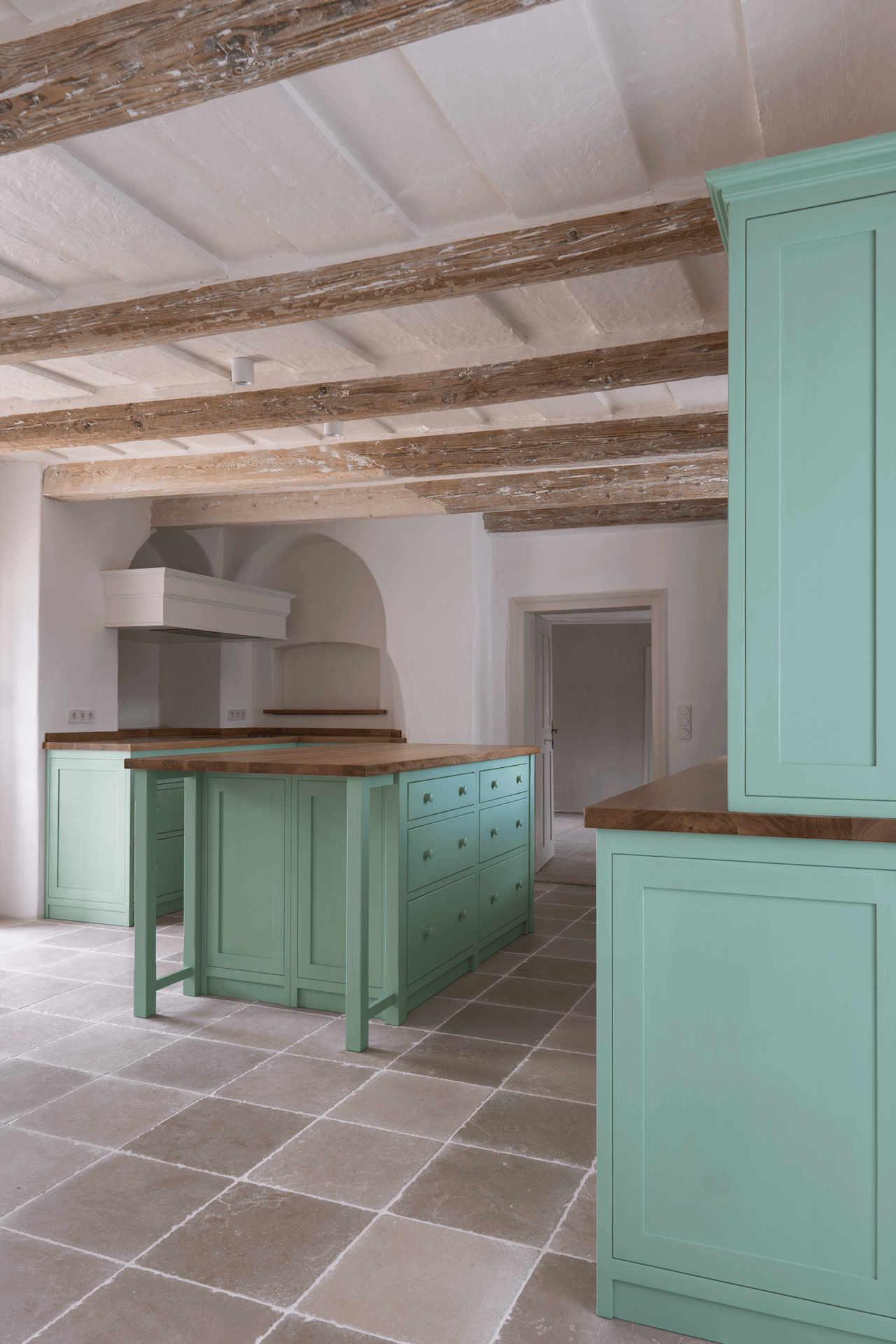 Projekt ve starém statku situovaném v Rakousku nám poskytl prostor, který se musel od základů změnit. Dominantou místnosti zůstaly krásné, odhalené stropní trámy, které dodaly celé místnosti půvab. Kuchyně s ručním nátěrem v odstínu duck egg shell zelené barvy nádherně koresponduje s masivní dubovou pracovní deskou a navozuje tím čistou linii celého prostoru. Velké keramické umyvadlo podtrhuje venkovský design. Kuchyňský ostrov tvoří skvělý přechod mezi prostory a stává se tak nejen praktickým a estetickým doplňkem, ale také vybízí k posezení s rodinou či přáteli.