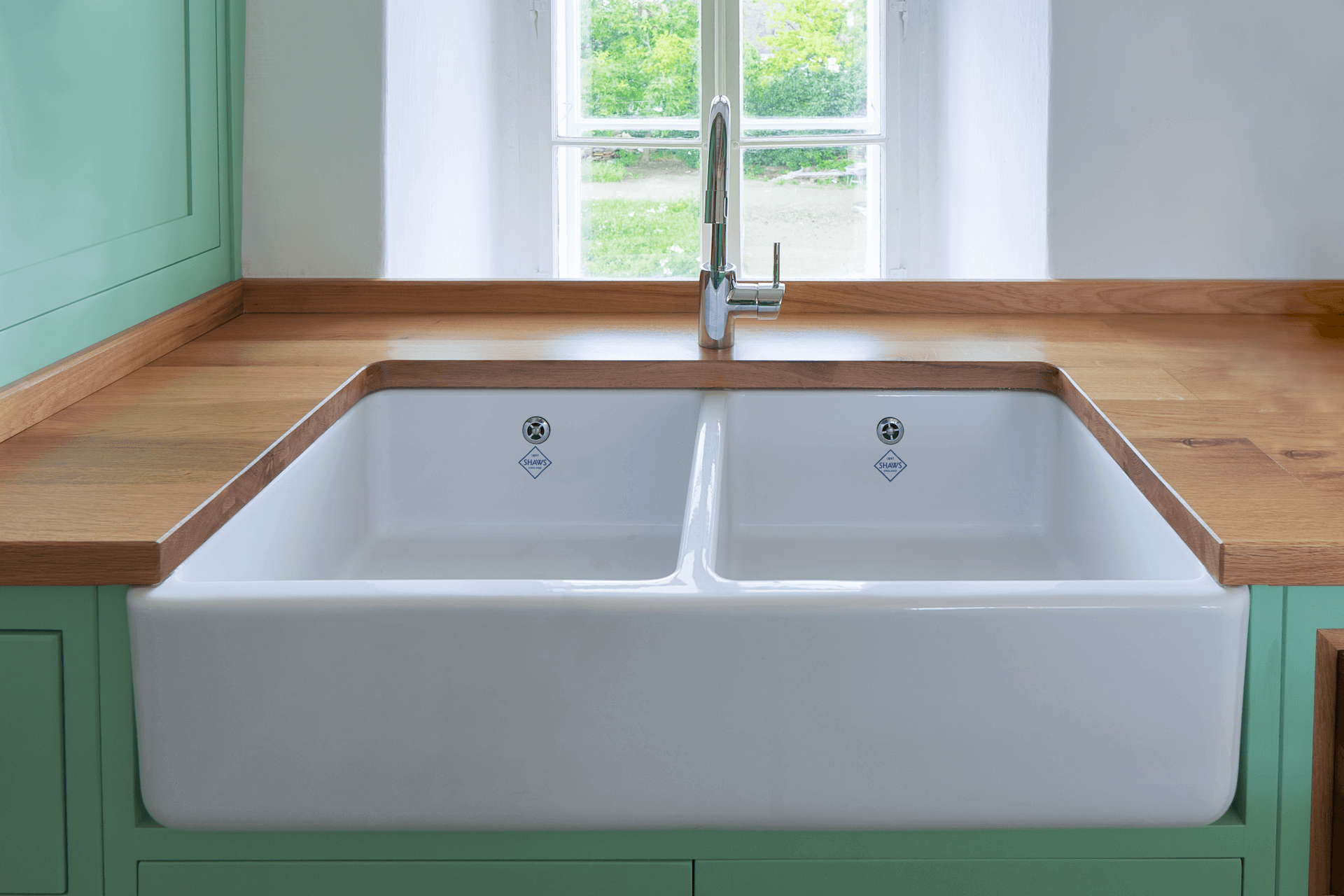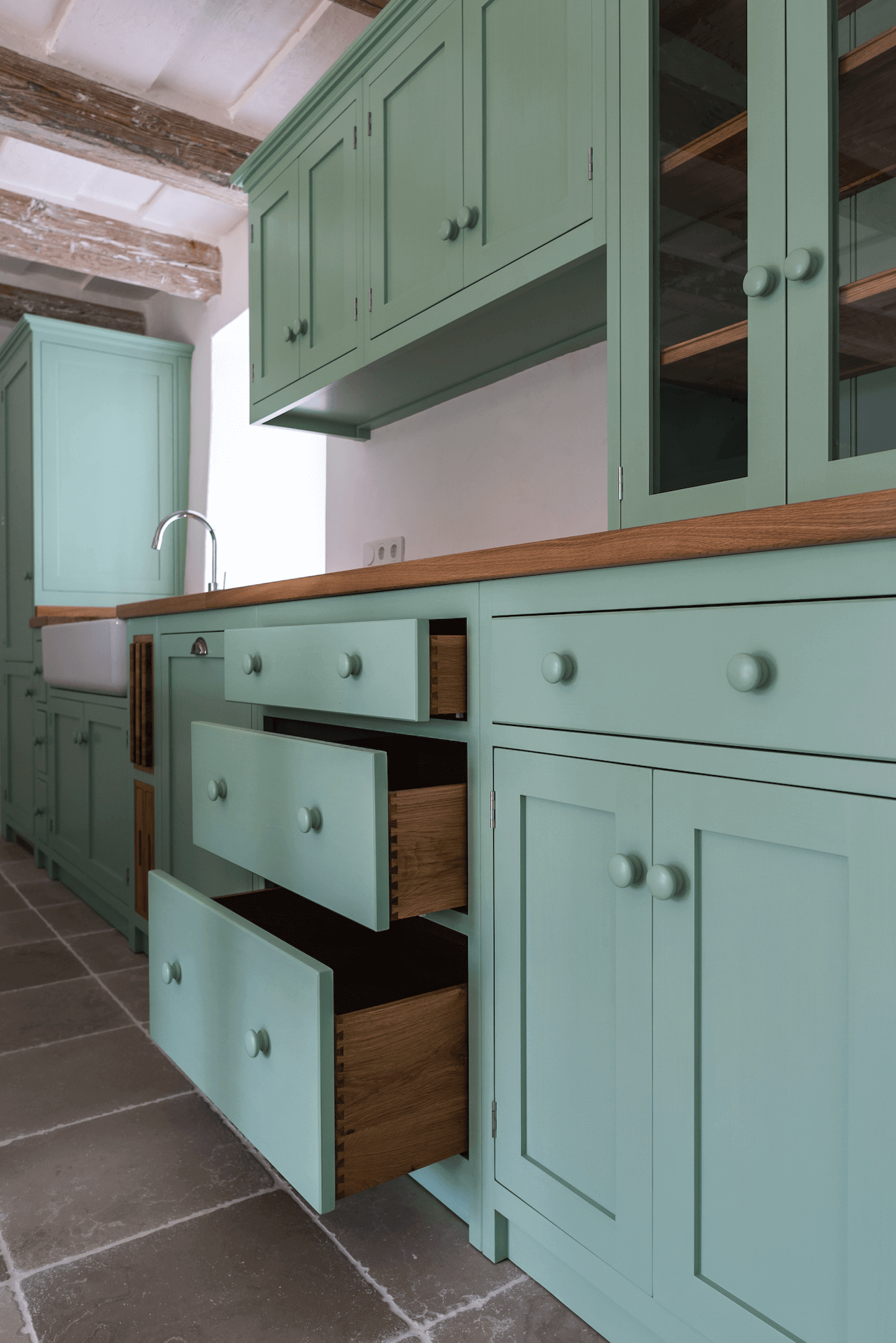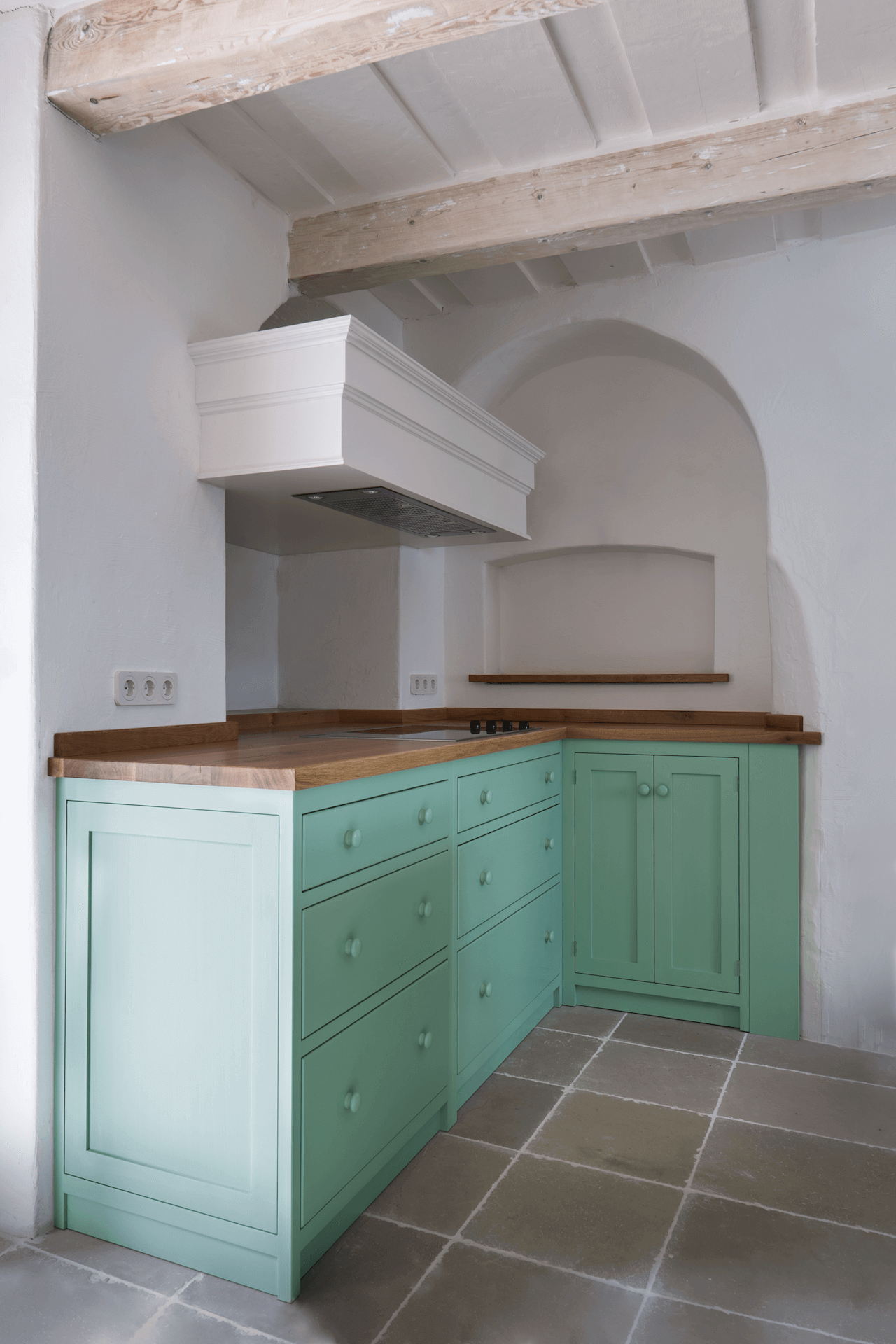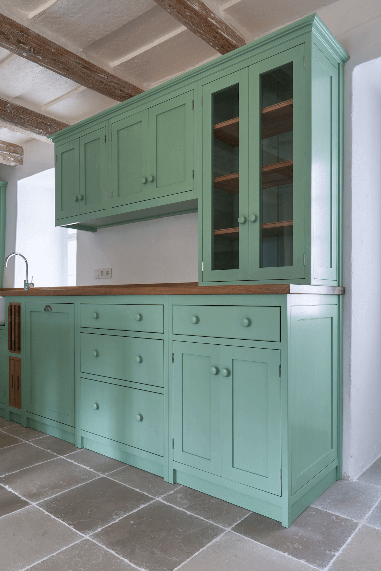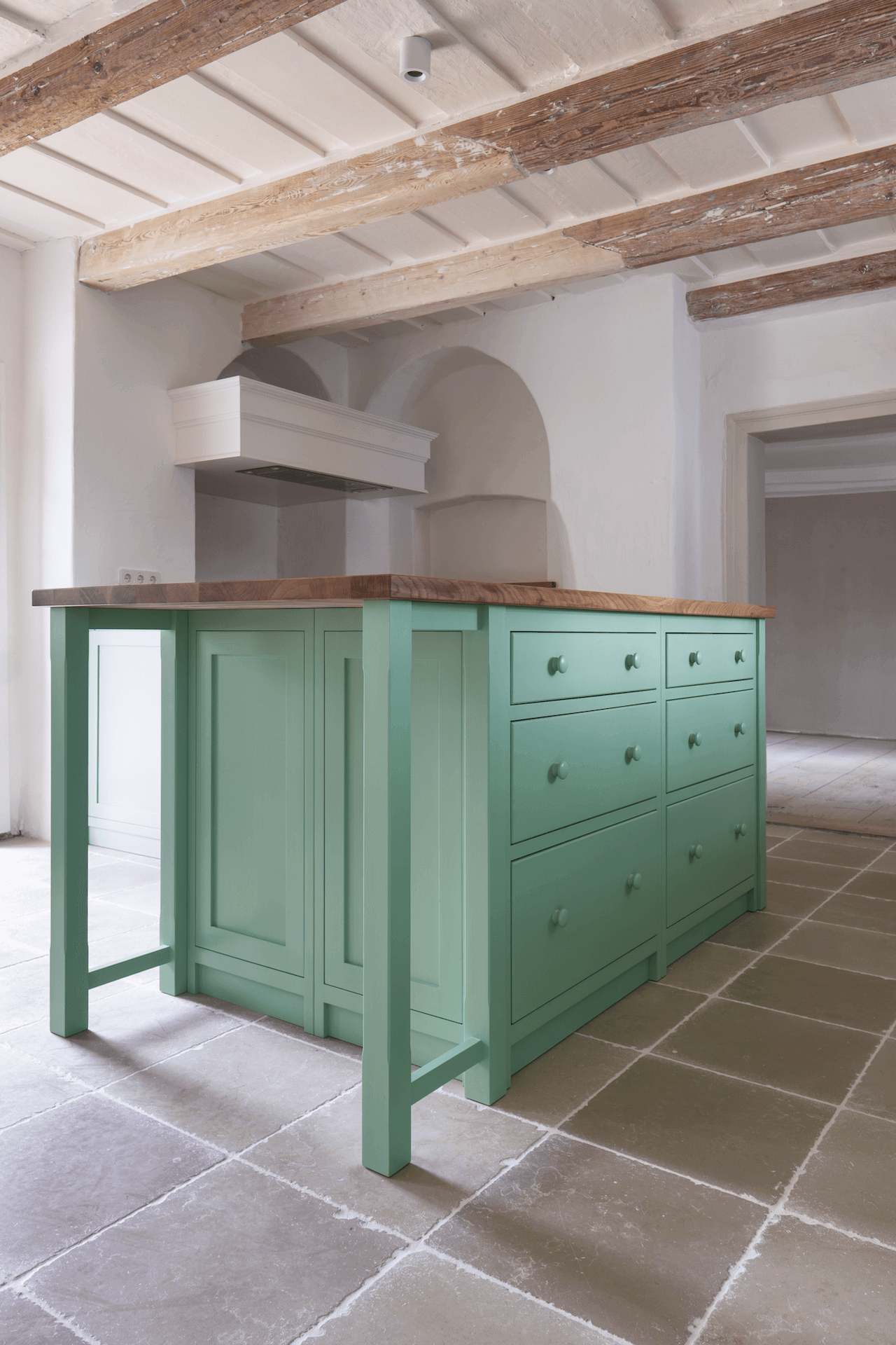Projekt ve starém statku situovaném v Rakousku nám poskytl prostor, který se musel od základů změnit. Dominantou místnosti zůstaly krásné, odhalené stropní trámy, které dodaly celé místnosti půvab. Kuchyně s ručním nátěrem v odstínu duck egg shell zelené barvy nádherně koresponduje s masivní dubovou pracovní deskou a navozuje tím čistou linii celého prostoru. Velké keramické umyvadlo podtrhuje venkovský design. Kuchyňský ostrov tvoří skvělý přechod mezi prostory a stává se tak nejen praktickým a estetickým doplňkem, ale také vybízí k posezení s rodinou či přáteli.