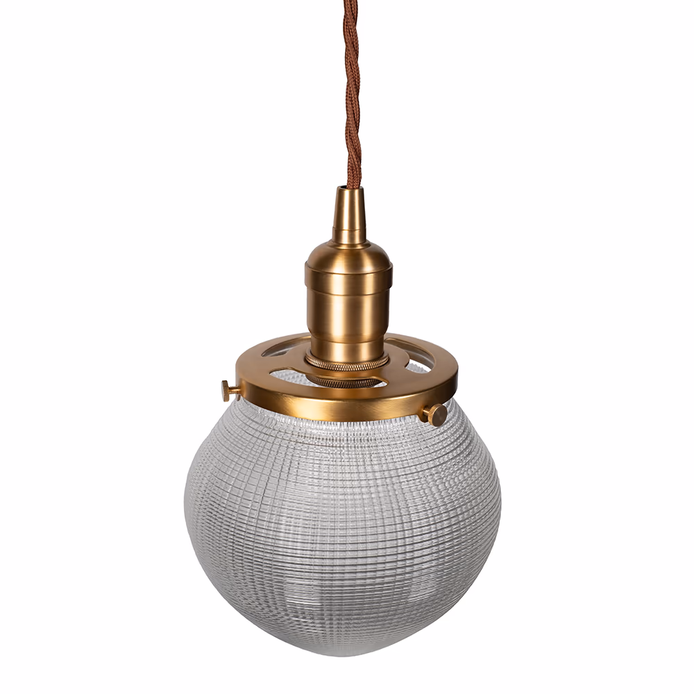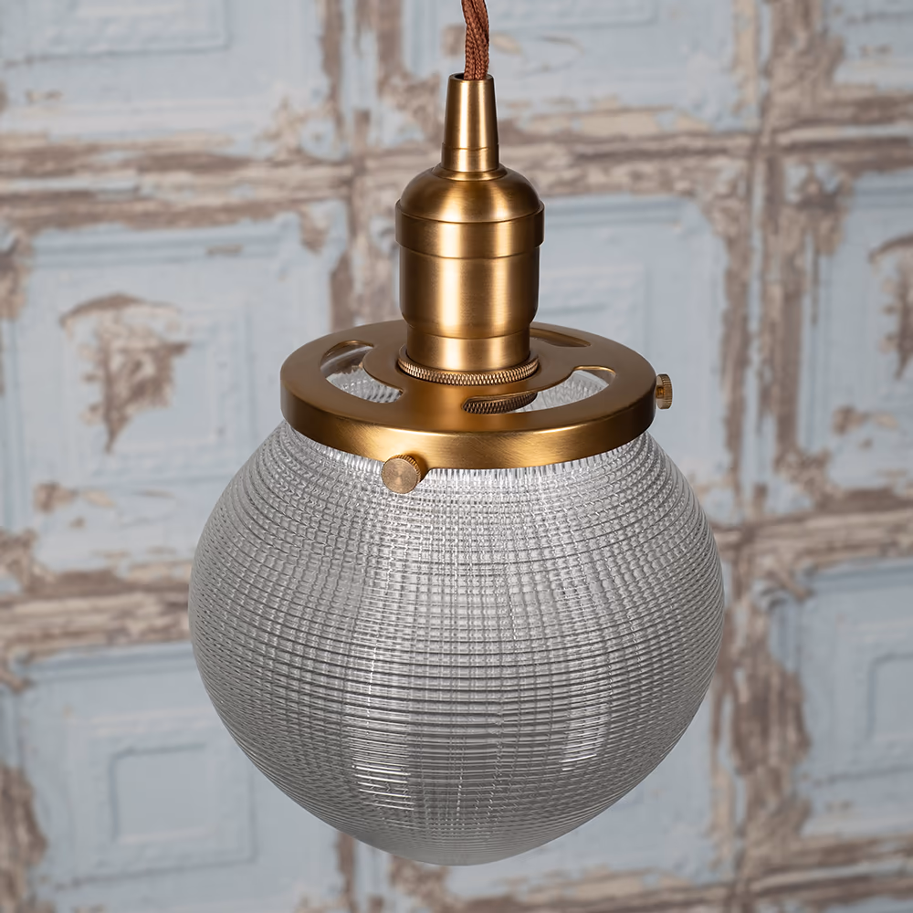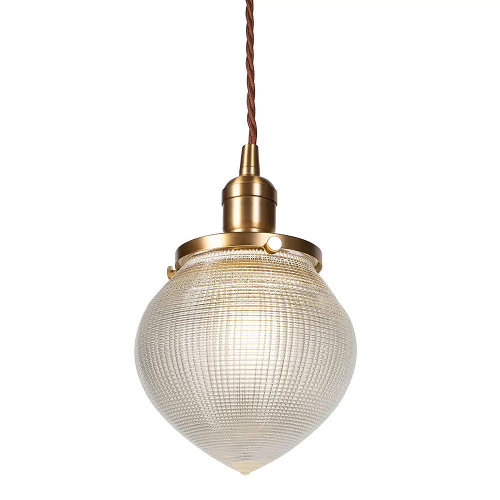 Hollen Acorn – závěsné svítidlo s prizmatickým sklem Holophane a mosaznou krytkou. Nadčasová elegance 30. let v moderním industriálním stylu.