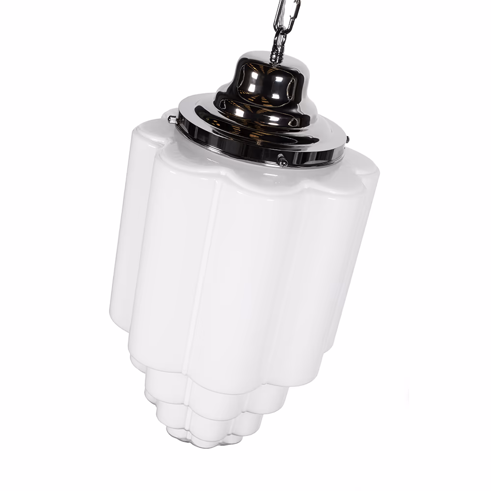 Glasshouse Pendant – závěsné svítidlo z masivní mosazi a kvalitního skla ve variantě opálové. Nadčasový design inspirovaný 20. stoletím v provedení polished nickel.