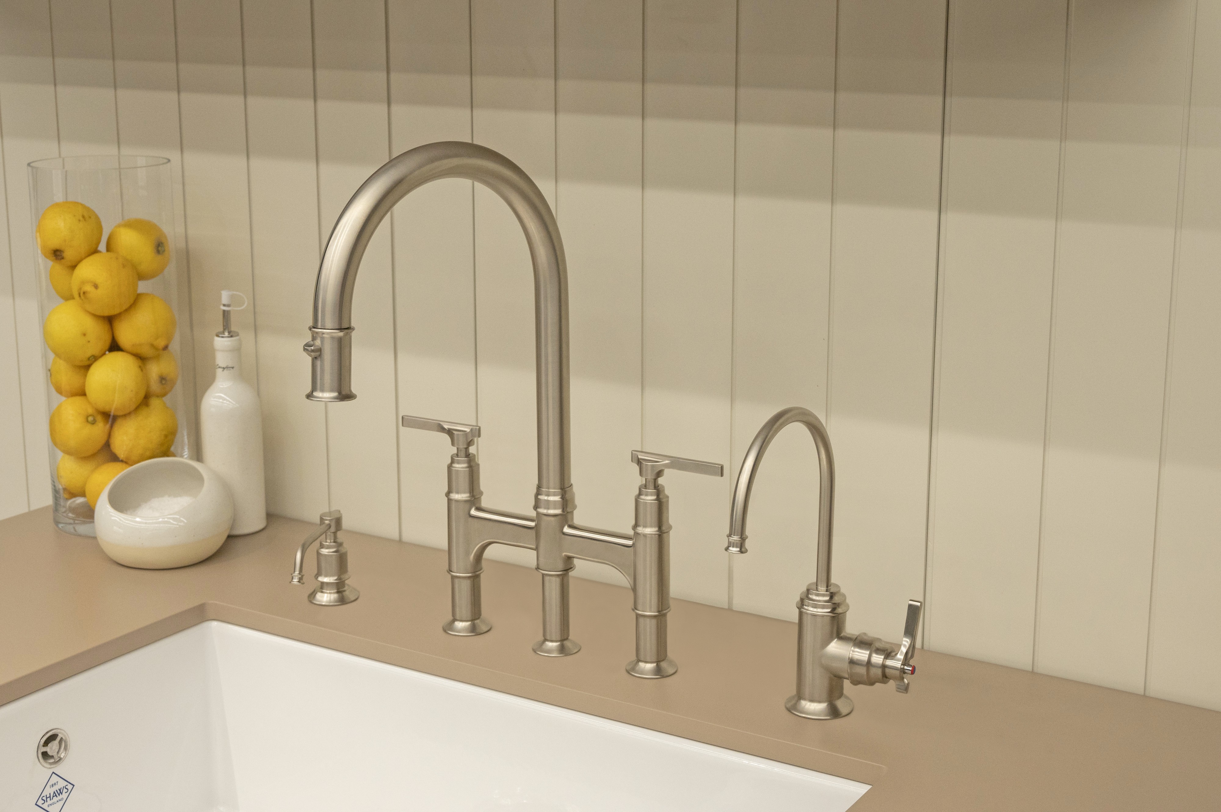 Krásné odkazy na nábytek Roberta Heritagea a Gordona Russella dodávají baterii Southbank Bridge pravý duch poloviny století. Štíhlý most s hladkými oblouky a jemně tvarovanými pákami odráží klíčové formy dřevozpracování té doby. Vylepšeno výsuvnou sprškou, diskrétně ukrytou ve výtoku.