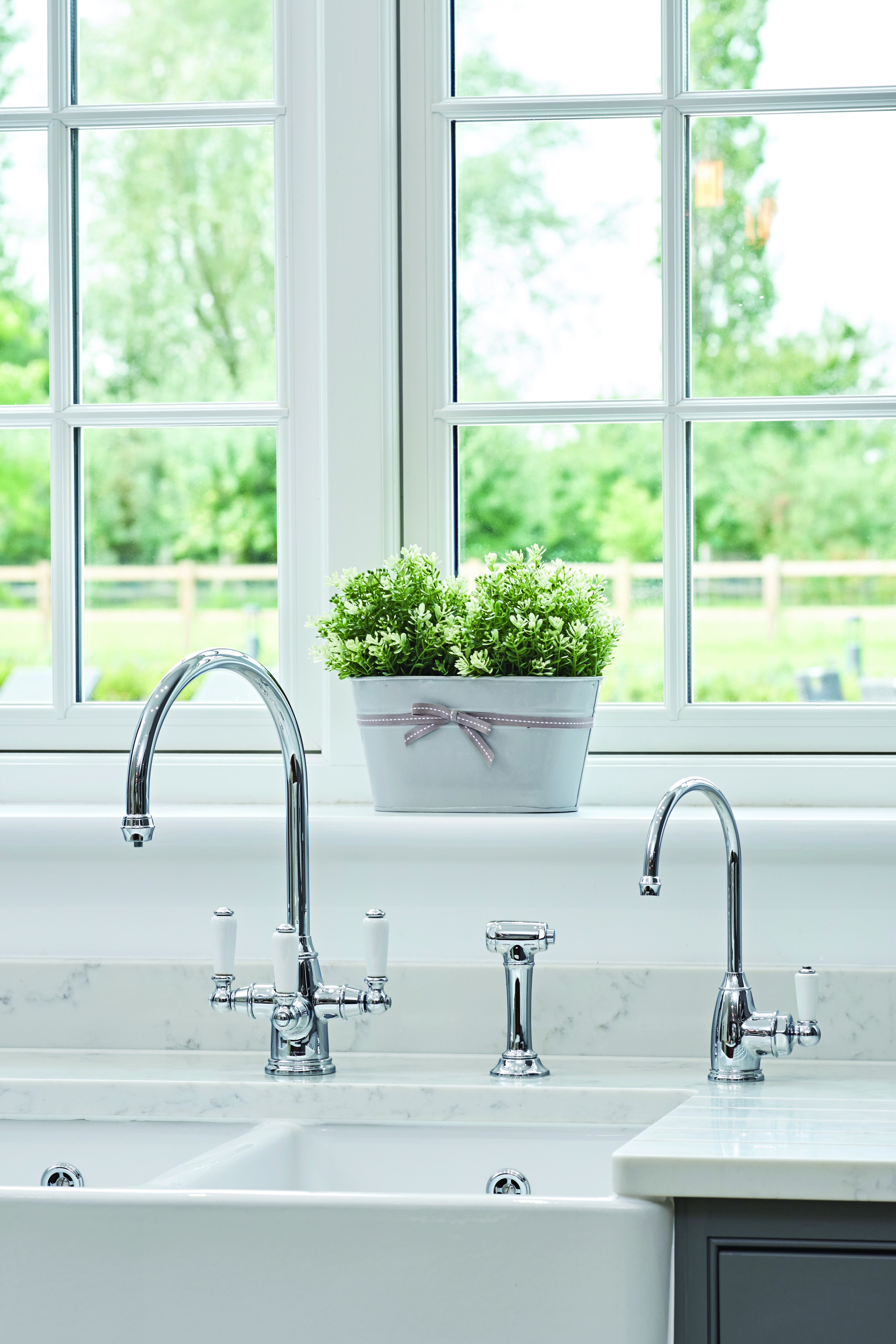 Krásný klasický styl bez kompromisů v oblasti technologie – směšovač Phoenician s vestavěnou filtrací nabízí teplou a studenou vodu i filtrovanou pitnou vodu z oddělené páky. Tato verze je také vybavena bočním oplachem namontovaným na desce, který slouží k oplachování dřezu a čištění hrnců a pánví.
