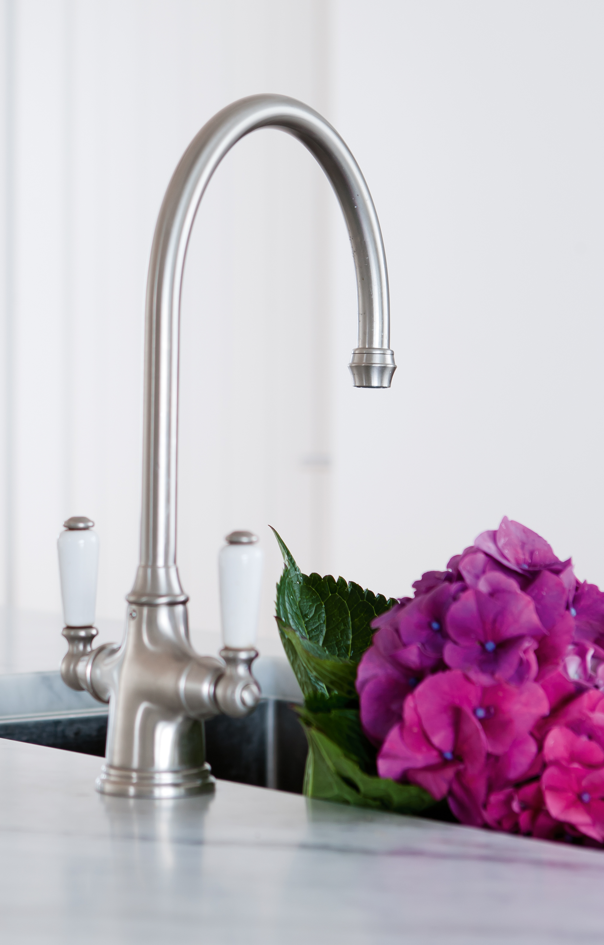 Monobloková kuchyňská baterie Phoenician je nadčasovým doplňkem tradiční nebo venkovské kuchyně a jedním z našich nejprodávanějších modelů. Díky krásným porcelánovým vložkám na dvou pákových rukojetích je to okamžitě rozpoznatelná baterie Perrin & Rowe.