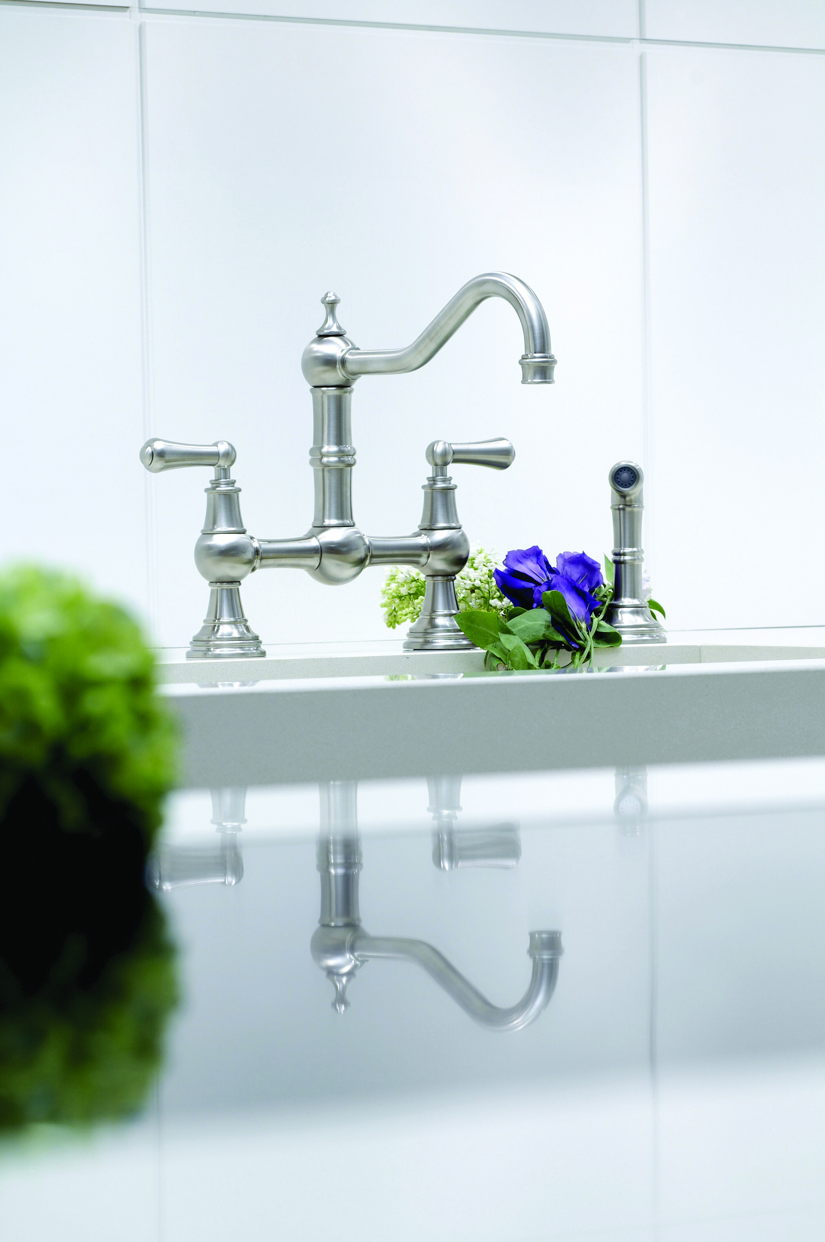 Provence mostová baterie s pákovými rukojeťmi je francouzskou variantou klasické mostové baterie. Je krásným doplňkem kuchyní ve venkovském stylu a perfektně se hodí k mini instantní nebo filtrační baterii. Tato verze je vybavena bočním oplachovačem rukou.