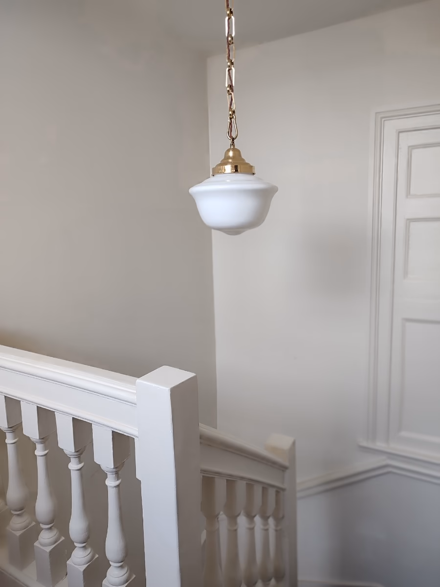 Matné opálové sklo vytváří měkké, hřejivé světlo a navozuje příjemnou atmosféru v každém interiéru. Mosazná krytka i řetěz jsou dostupné ve variantách leštěná mosaz, lakovaná patinovaná mosaz nebo leštěný nikl, takže si snadno vyberete provedení, které dokonale zapadne do vašeho domova.