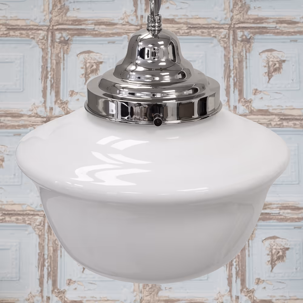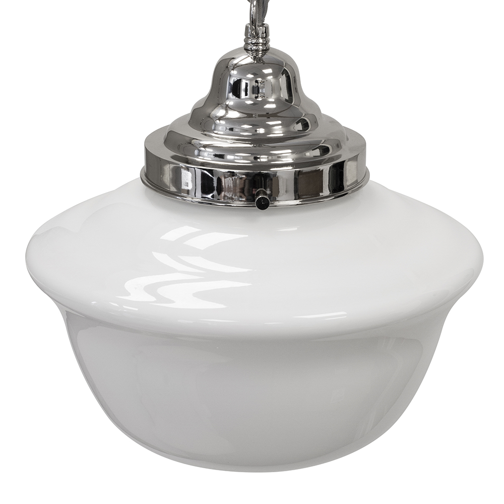 Matné opálové sklo vytváří měkké, hřejivé světlo a navozuje příjemnou atmosféru v každém interiéru. Mosazná krytka i řetěz jsou dostupné ve variantách leštěná mosaz, lakovaná patinovaná mosaz nebo leštěný nikl, takže si snadno vyberete provedení, které dokonale zapadne do vašeho domova.