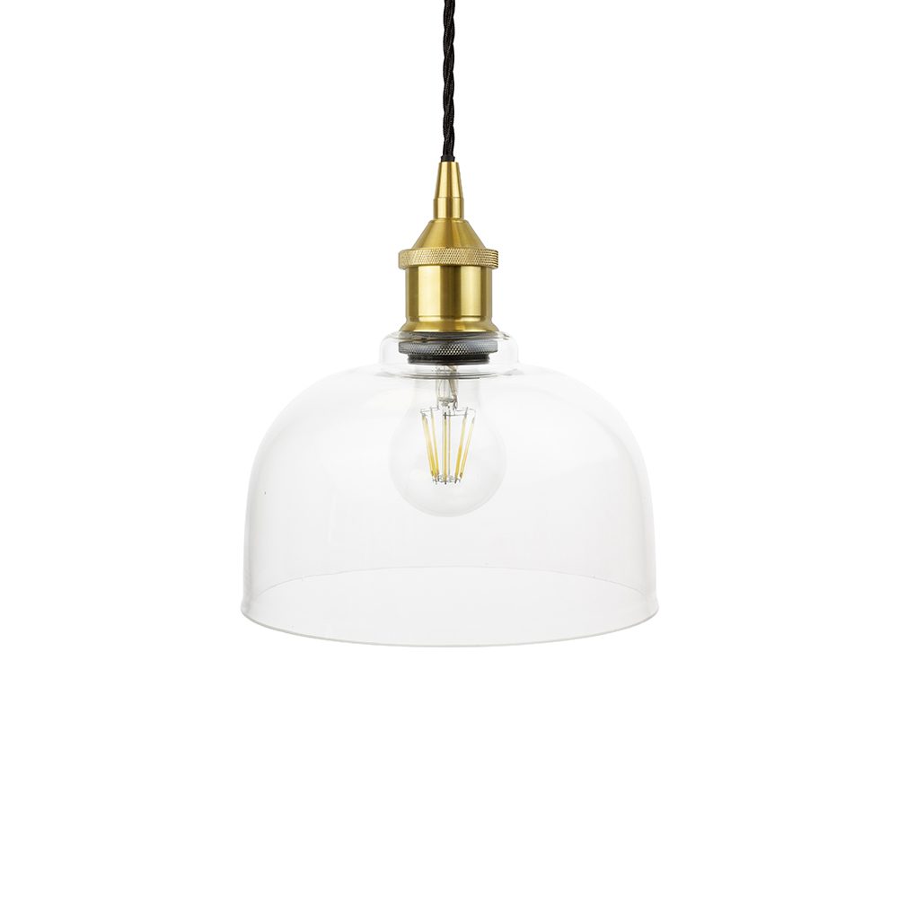 Závěsné svítidlo z ručně foukaného čirého skla s hlubokým kupolovitým stínidlem. Nadčasový design z britské kolekce Soho Glass Library.
