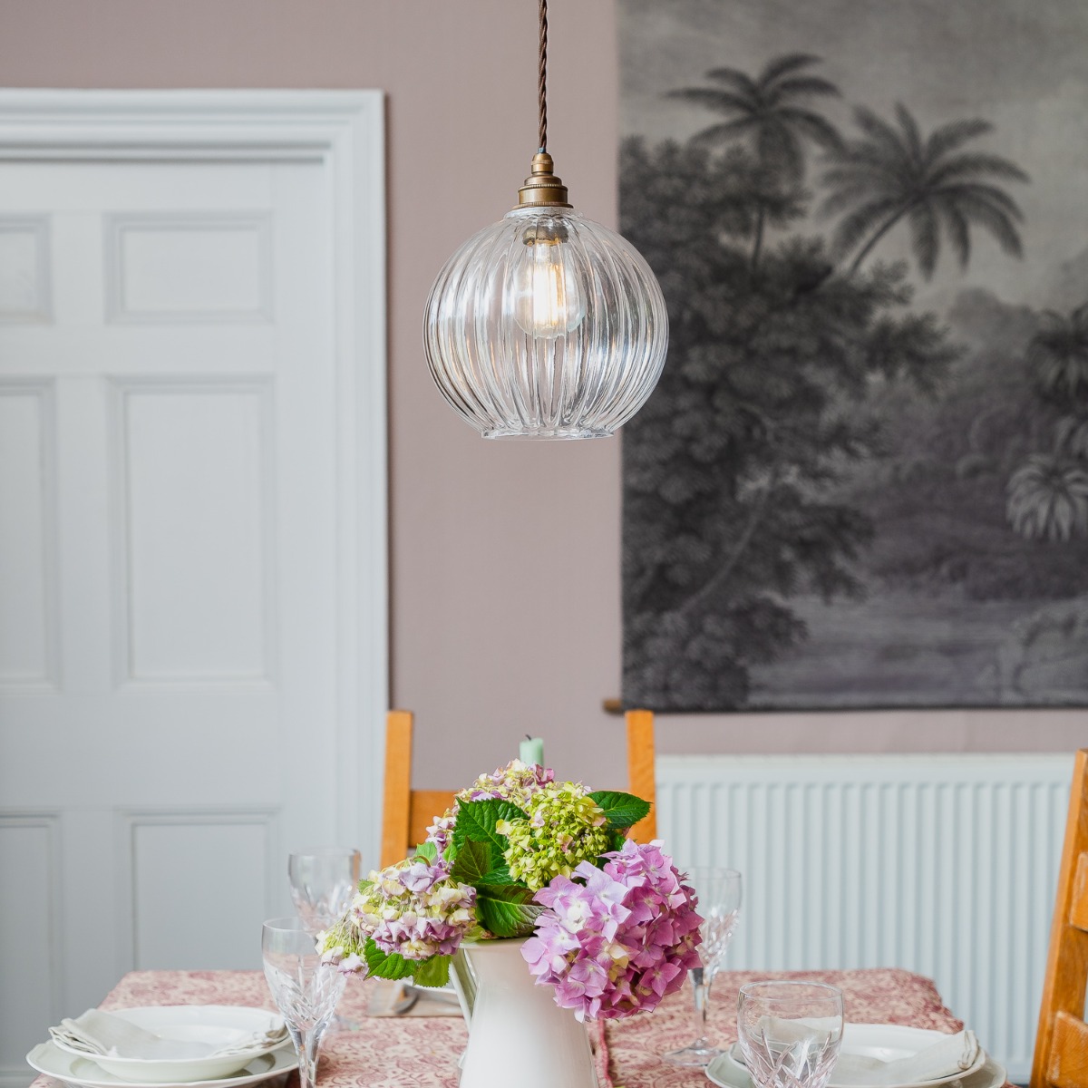 Henley Fluted Glass Globe – závěsné svítidlo z ručně foukaného žebrovaného skla. Elegantní součást britské kolekce Soho Glass Library, 1,5m závěsný kabel.