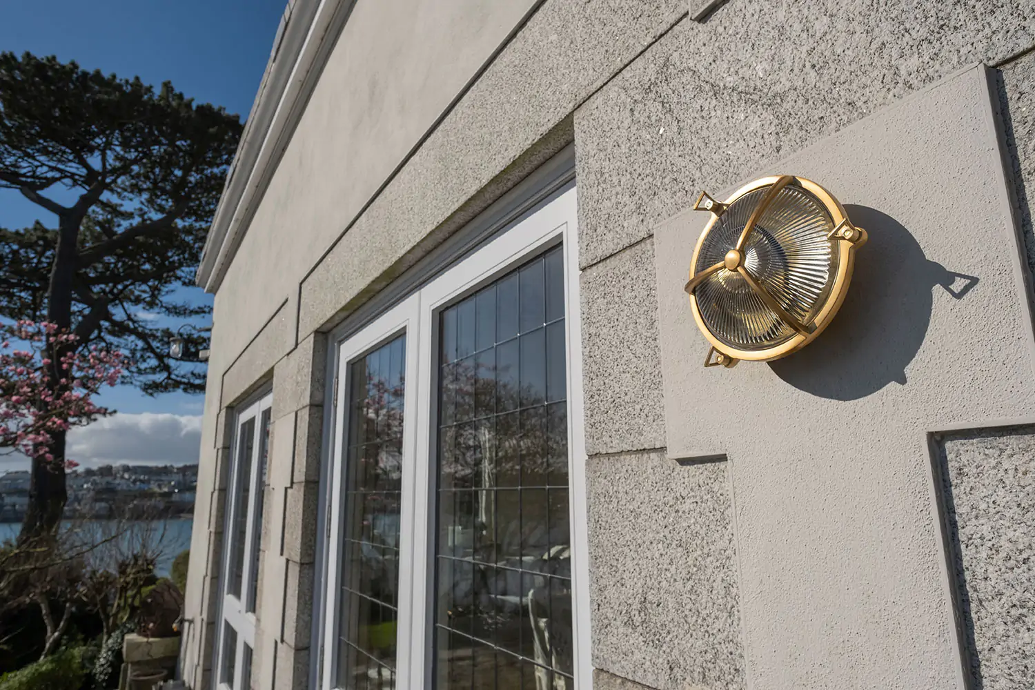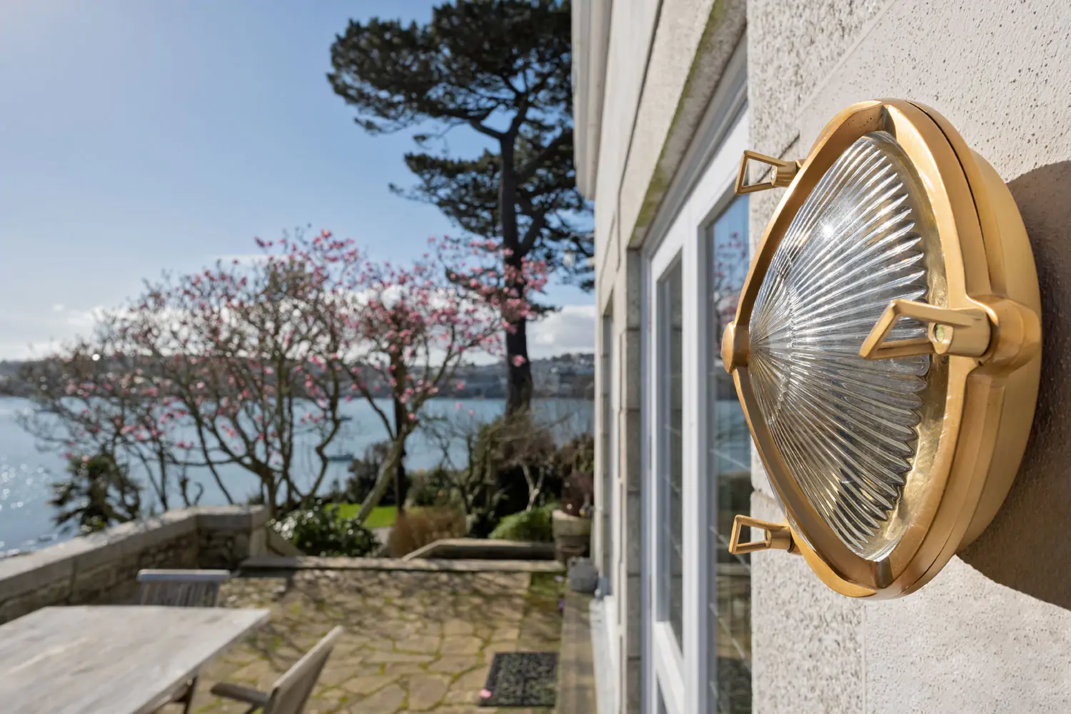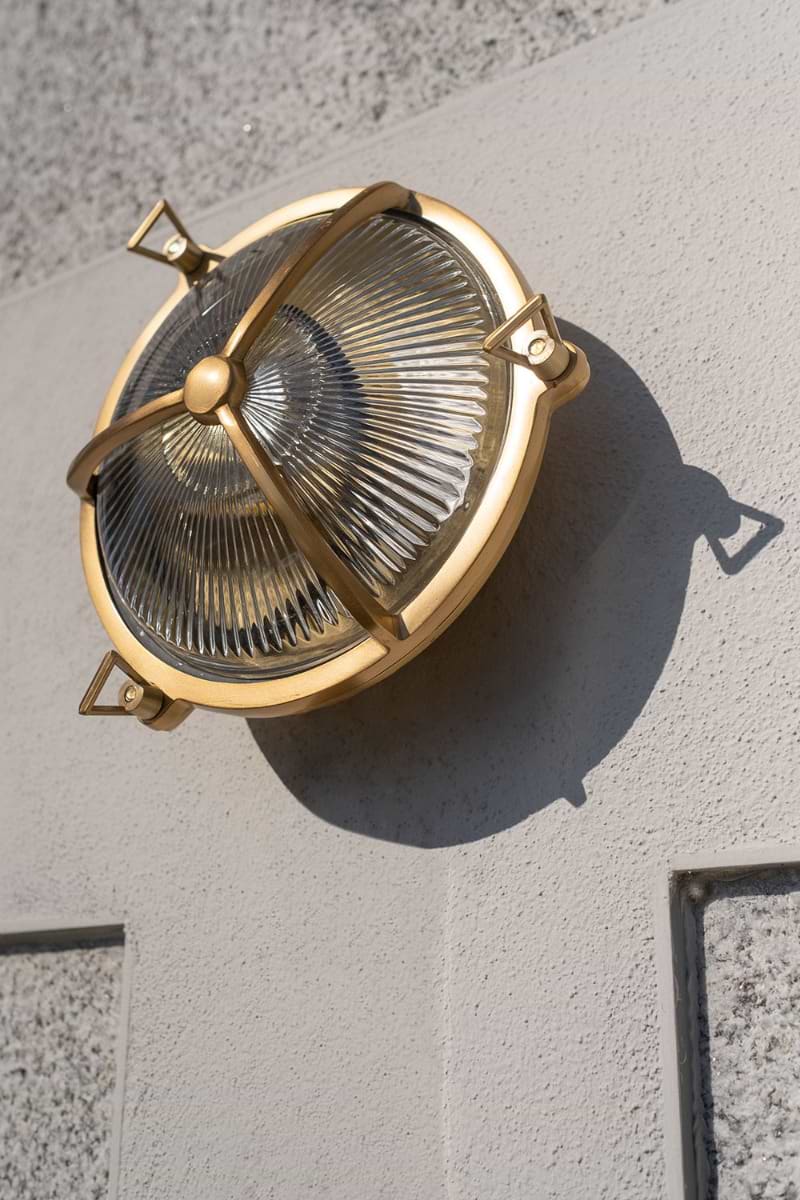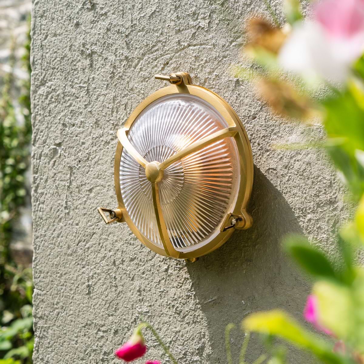 Venkovní bulkhead svítidlo z masivní mosazi s prizmatickým sklem a odnímatelným měděným krytem. Steampunkový námořnický design, krytí IP65, ruční výroba.
