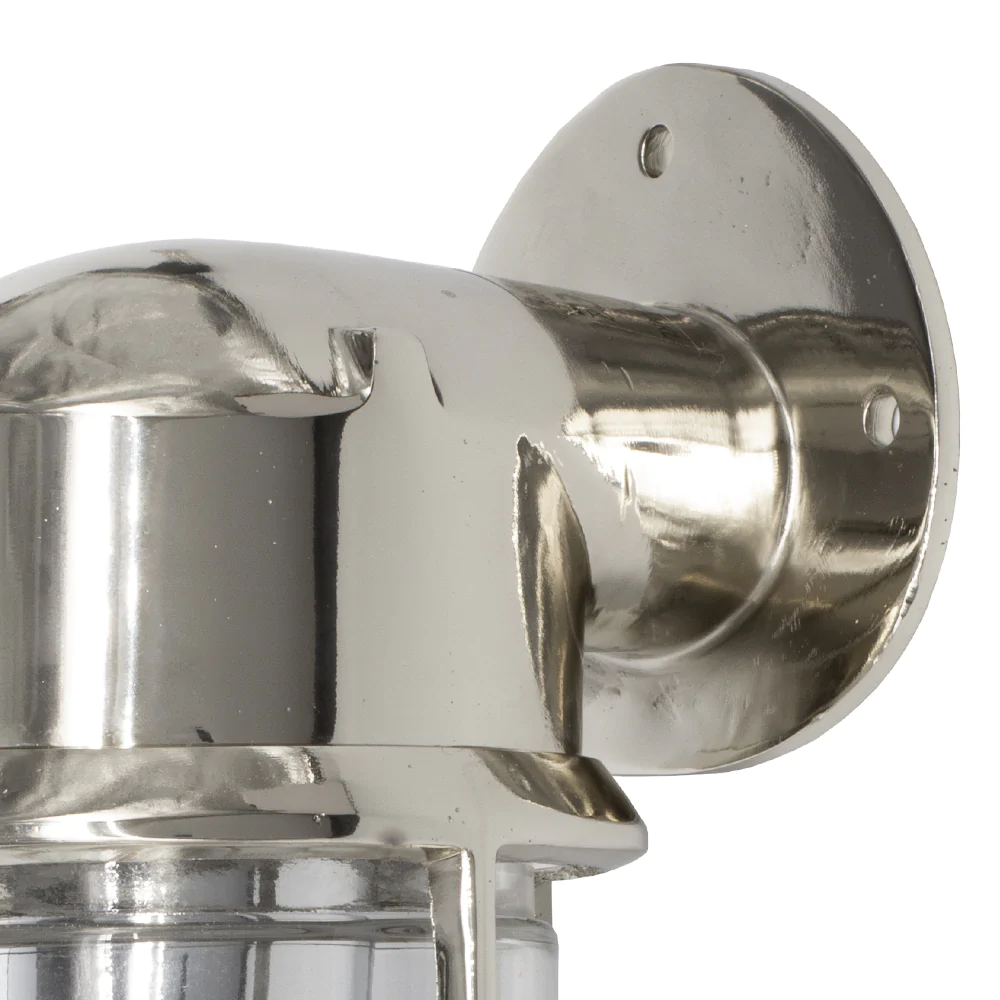Ručně vyráběné nástěnné svítidlo z masivní mosazi s niklovou povrchovou úpravou a krytím IP65. Vhodné do koupelen i exteriéru, ideální pro Edison LED žárovky.