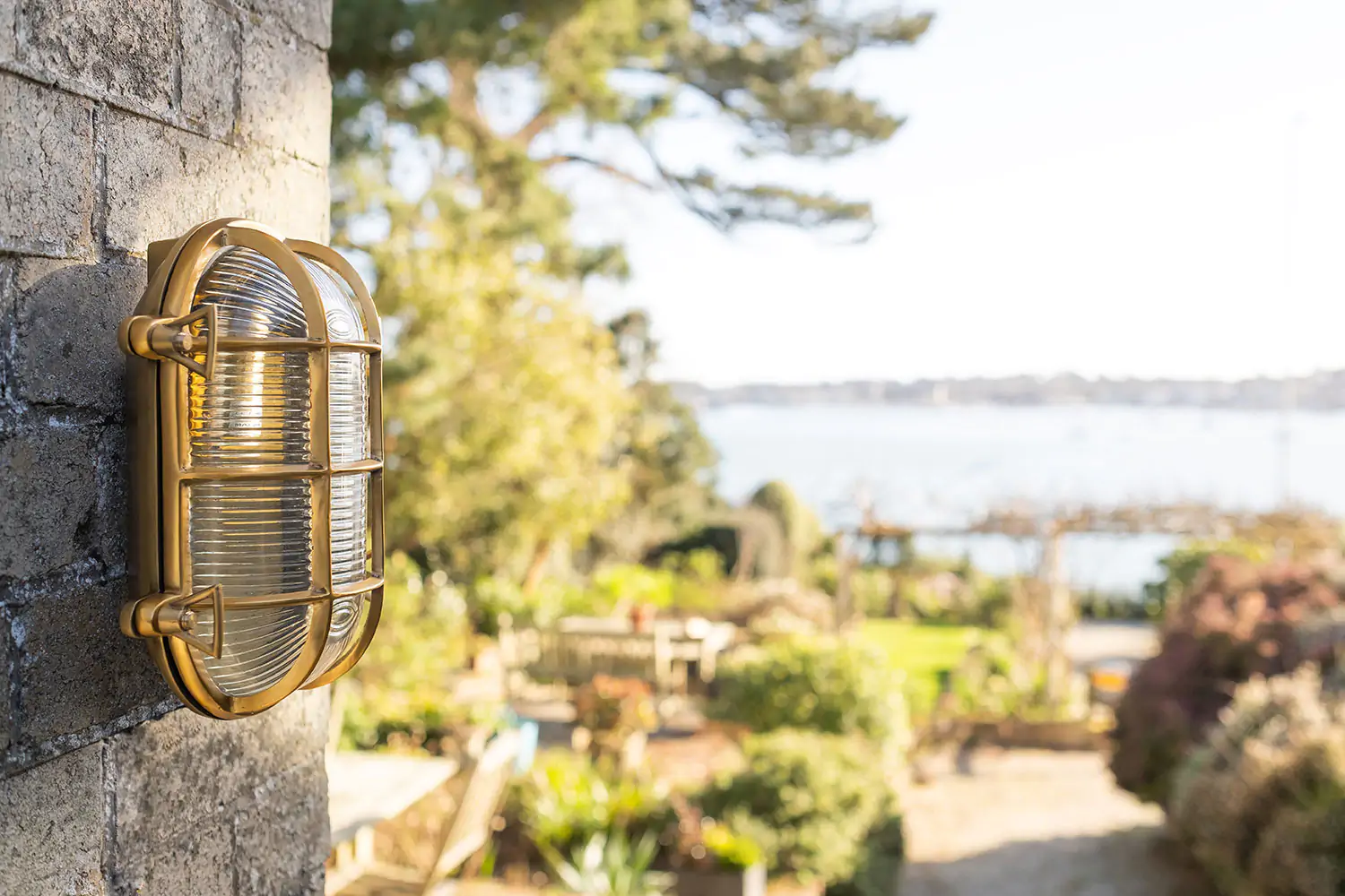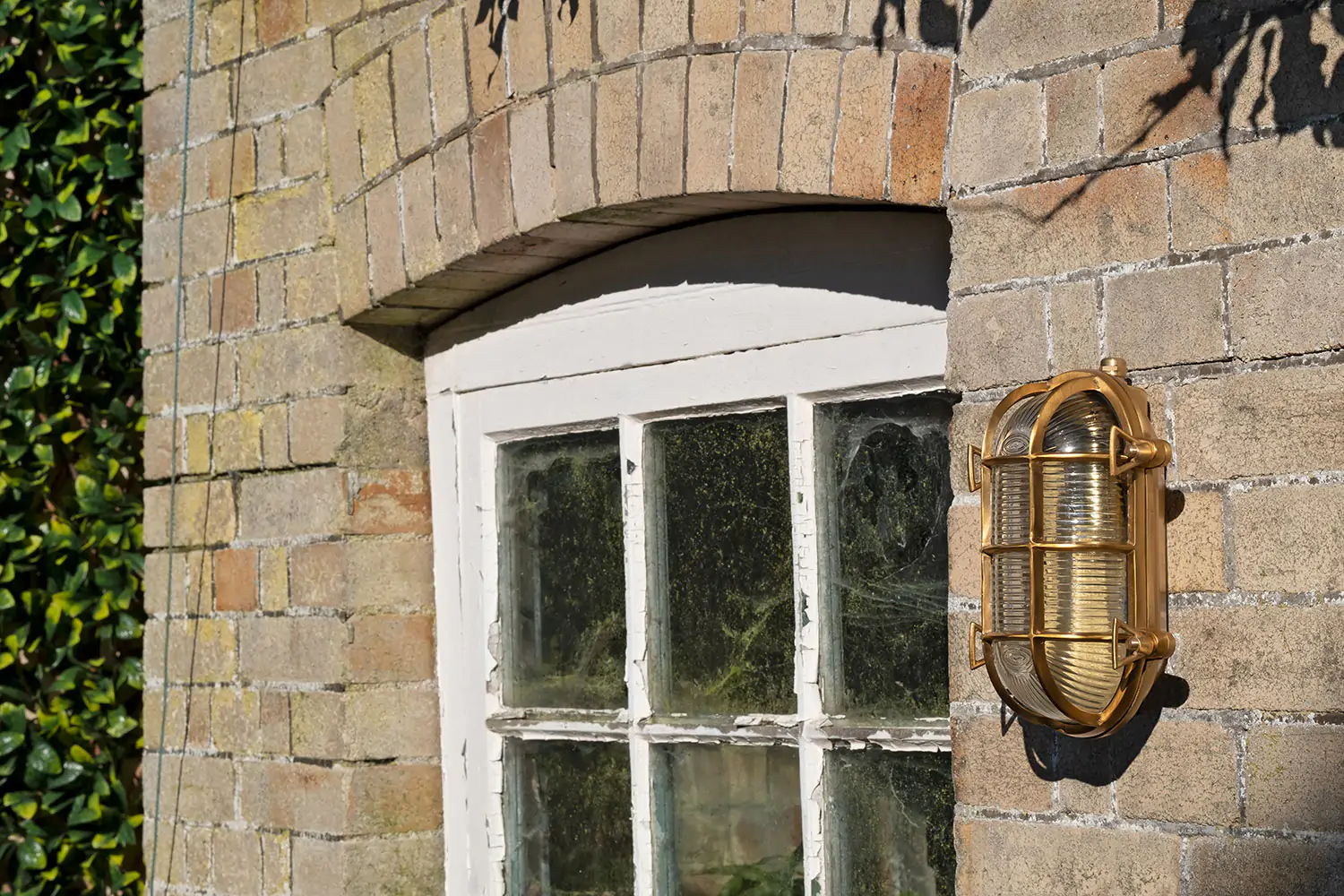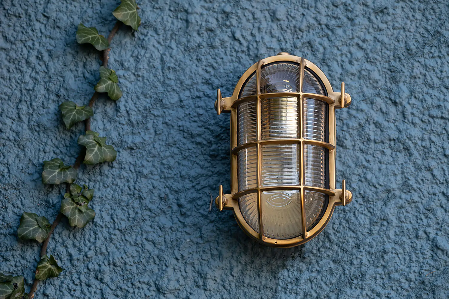 Flaxman – venkovní bulkhead svítidlo z masivní mosazi s leptaným sklem a krytím IP65. Námořnický design, ideální do exteriéru, koupelen i industriálních interiérů.