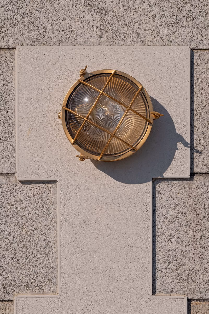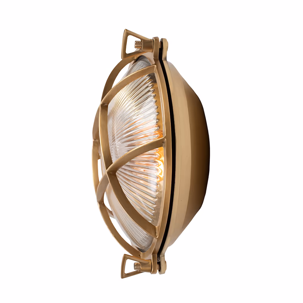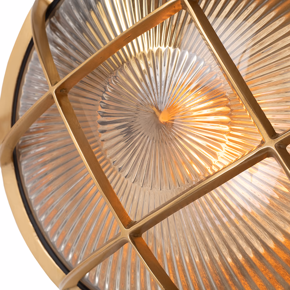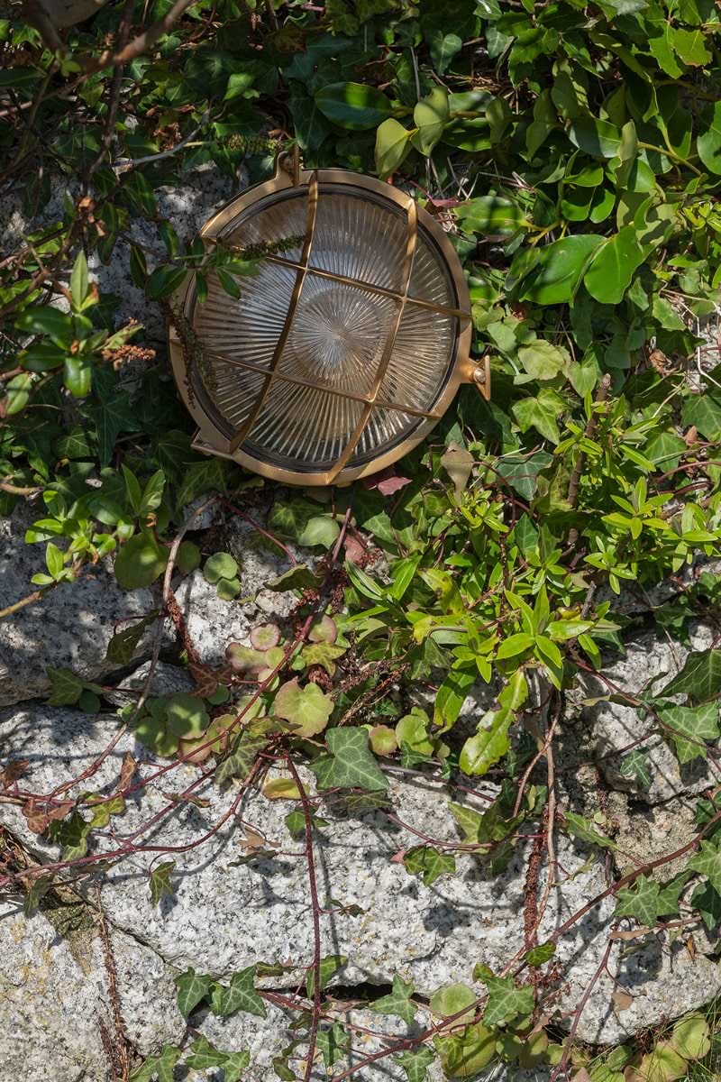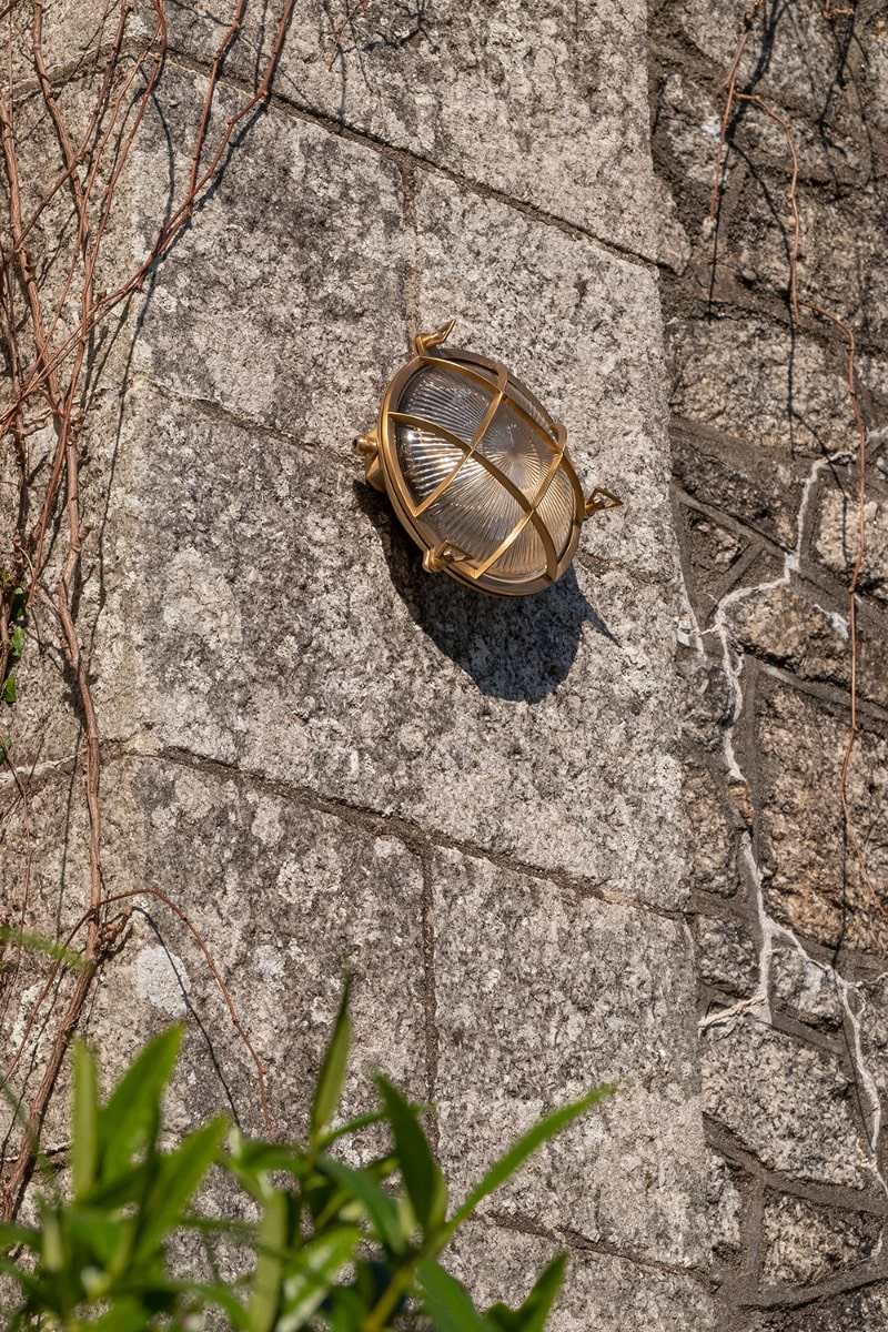 Kulaté venkovní bulkhead svítidlo z masivní mosazi s leptaným sklem a krytím IP65. Námořnický styl s lehce steampunkovým nádechem, vhodné do exteriéru i industriálních prostor.