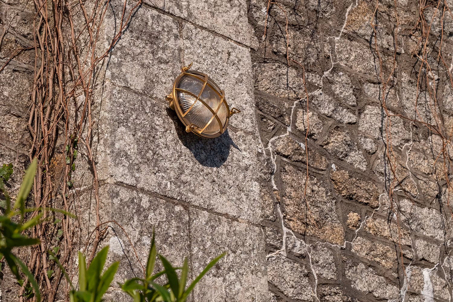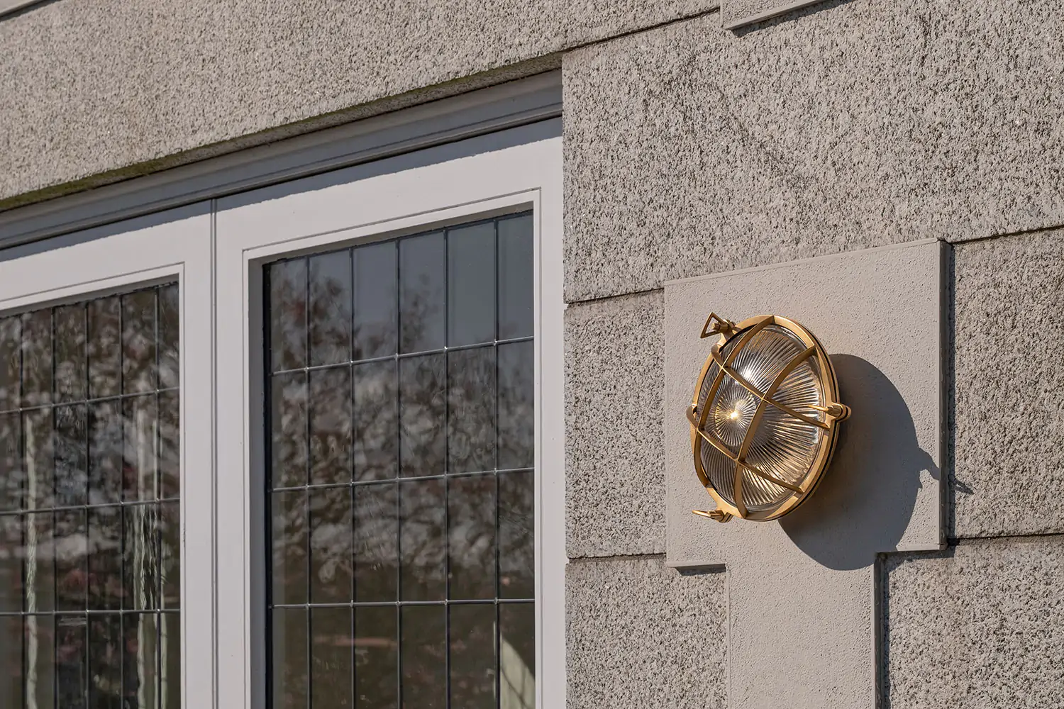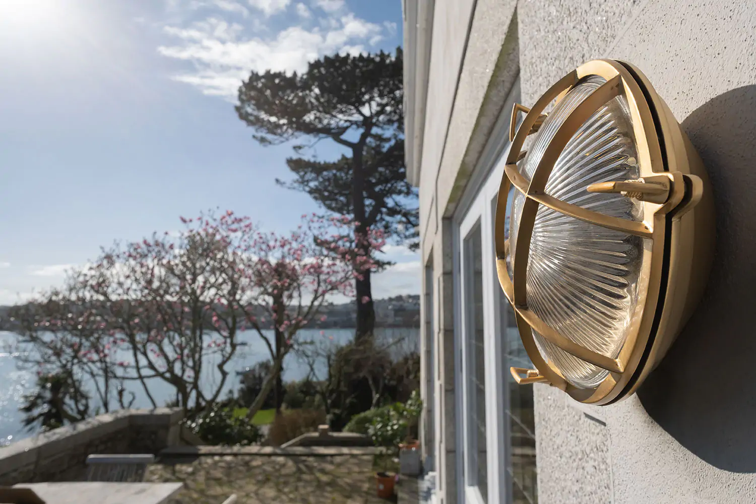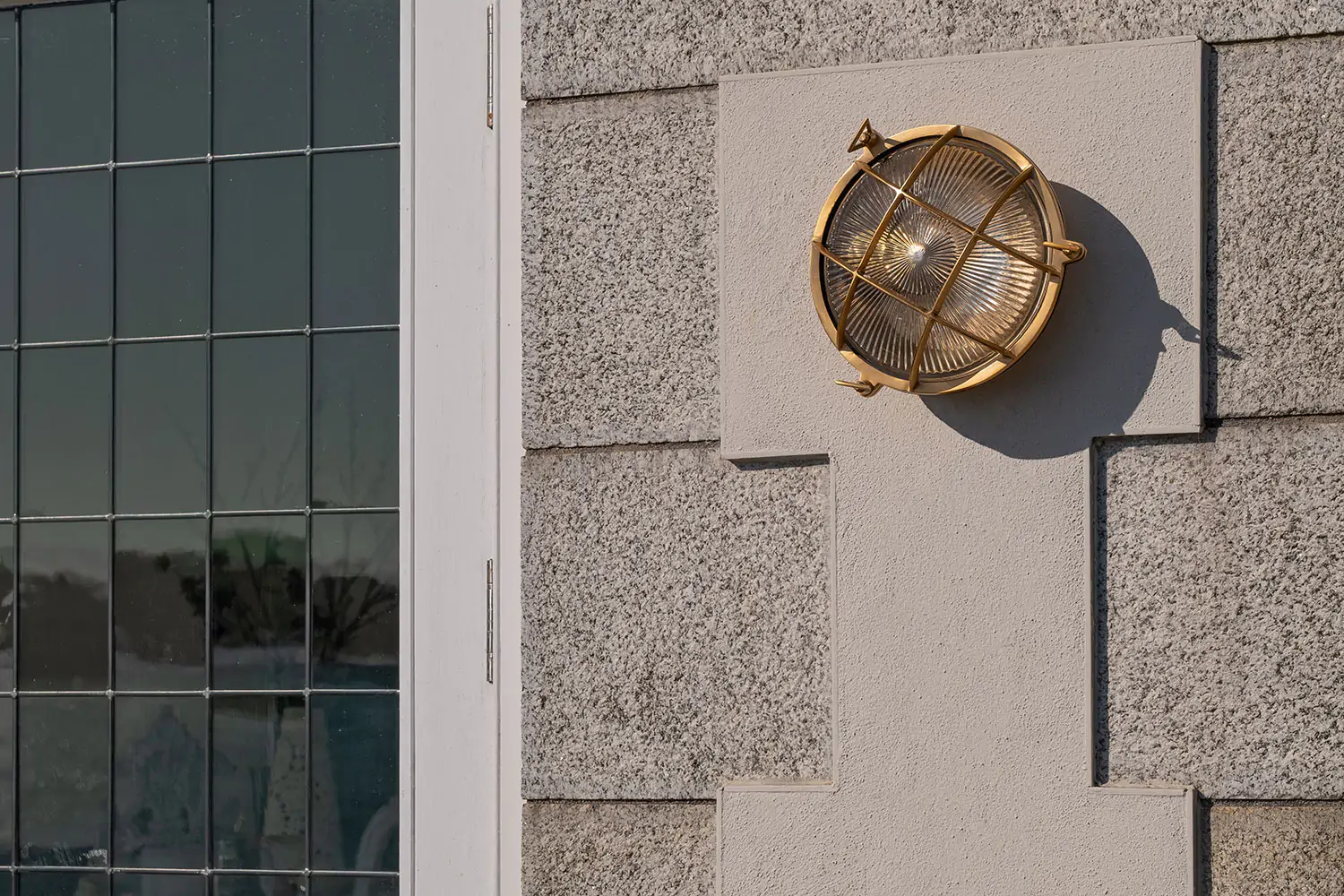 Kulaté venkovní bulkhead svítidlo z masivní mosazi s leptaným sklem a krytím IP65. Námořnický styl s lehce steampunkovým nádechem, vhodné do exteriéru i industriálních prostor.