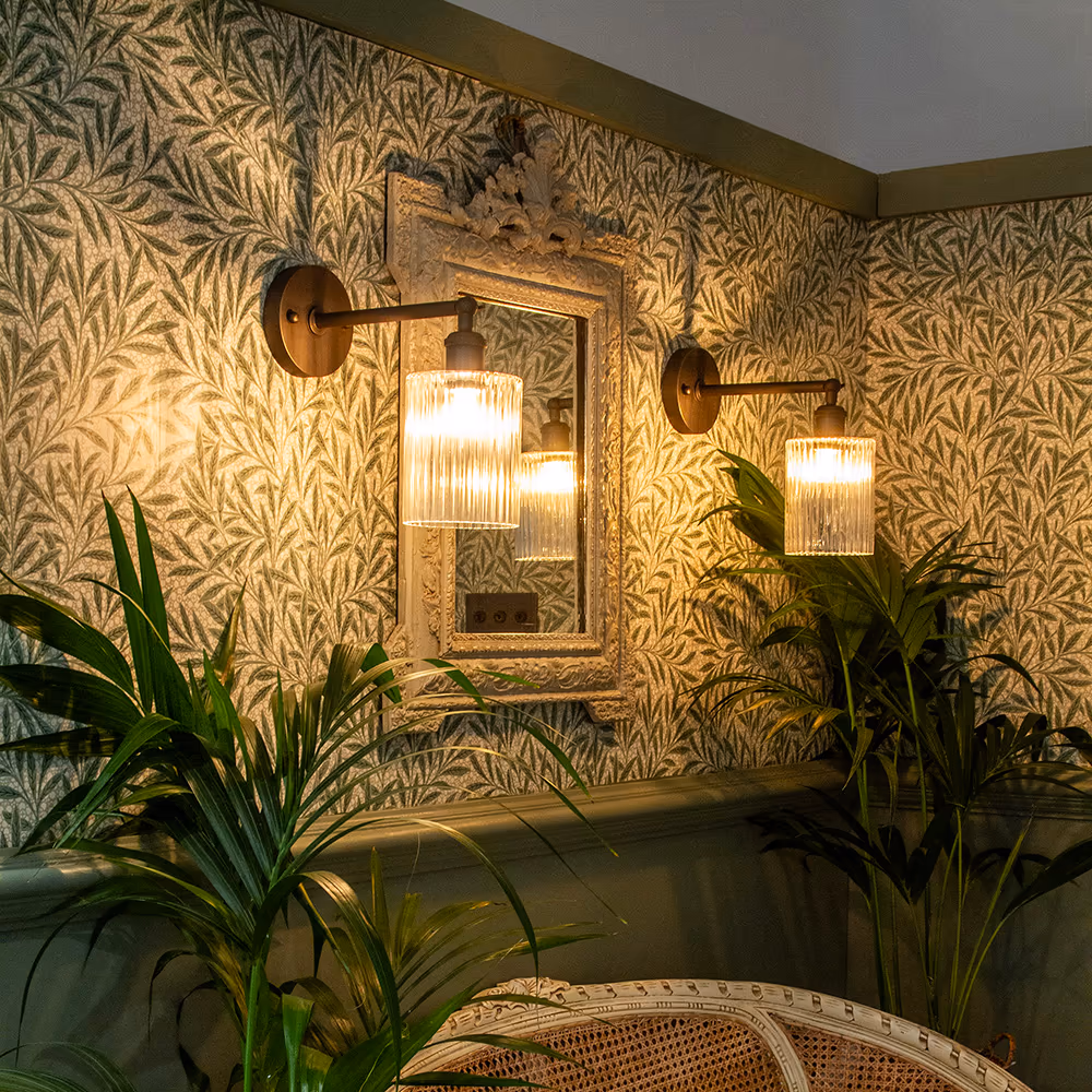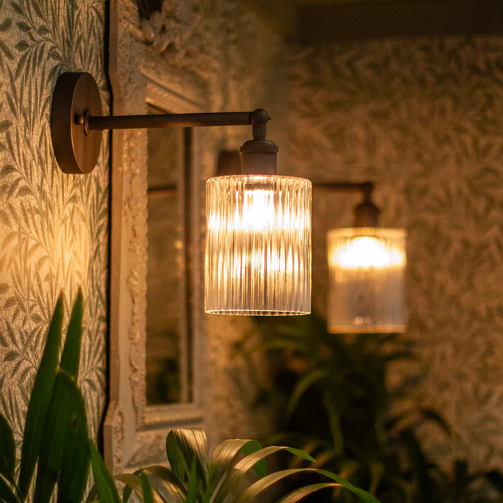 Cylinde – drobné nástěnné svítidlo s ručně foukaným žebrovaným sklem a nastavitelným ramenem, dostupné v mosazné nebo bronzové úpravě.
