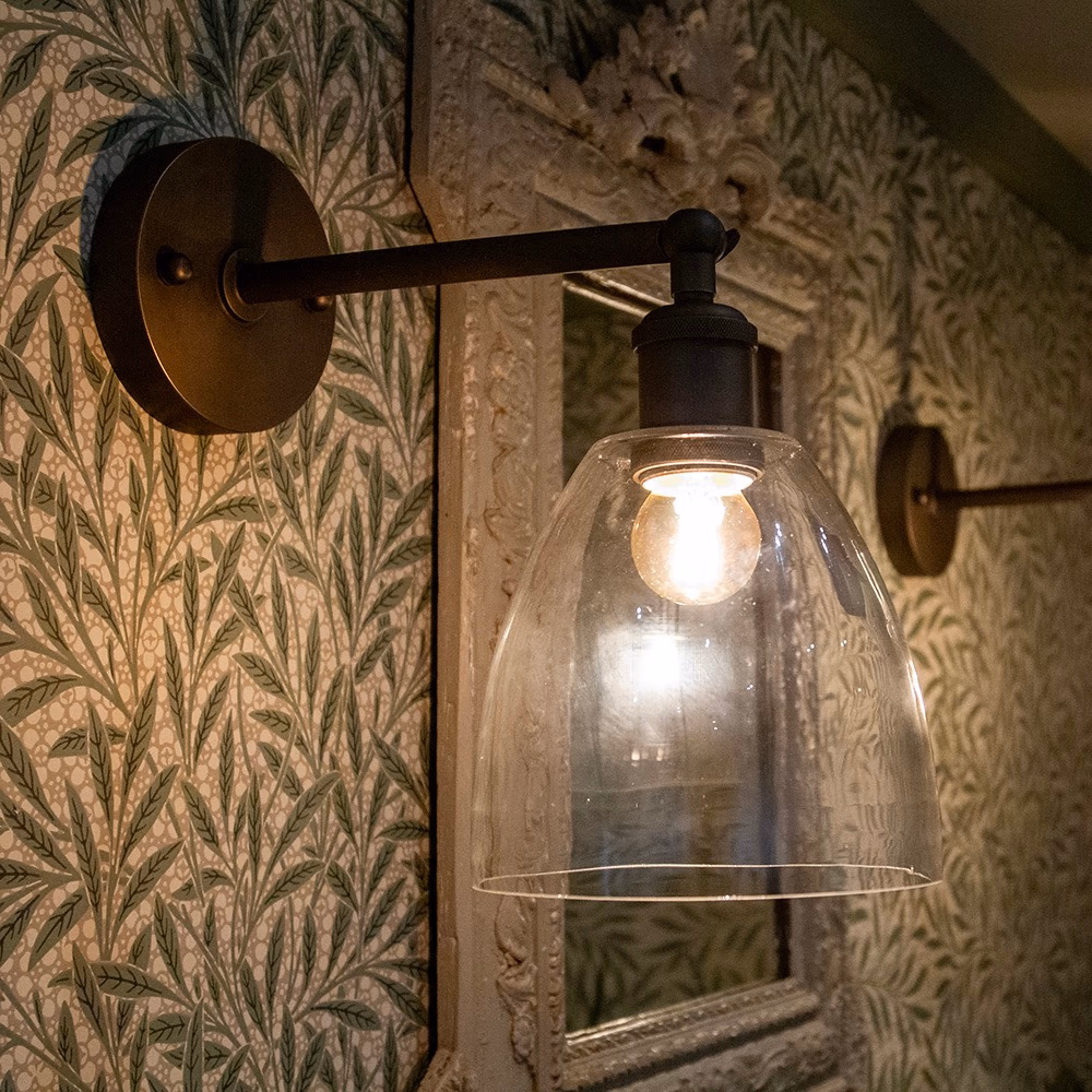 Potter – nástěnné svítidlo z čirého skla s nastavitelným ramenem. Ideální pro vintage LED žárovky, dostupné v povrchové úpravě bronz.