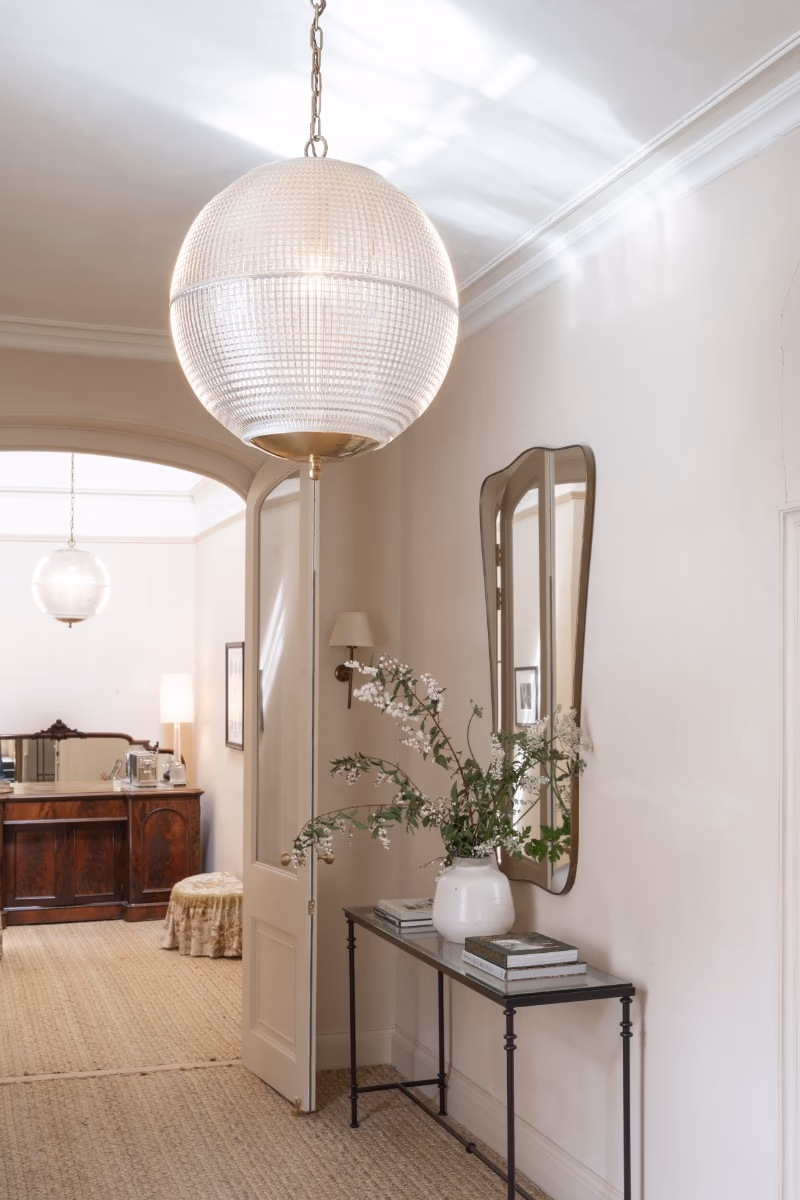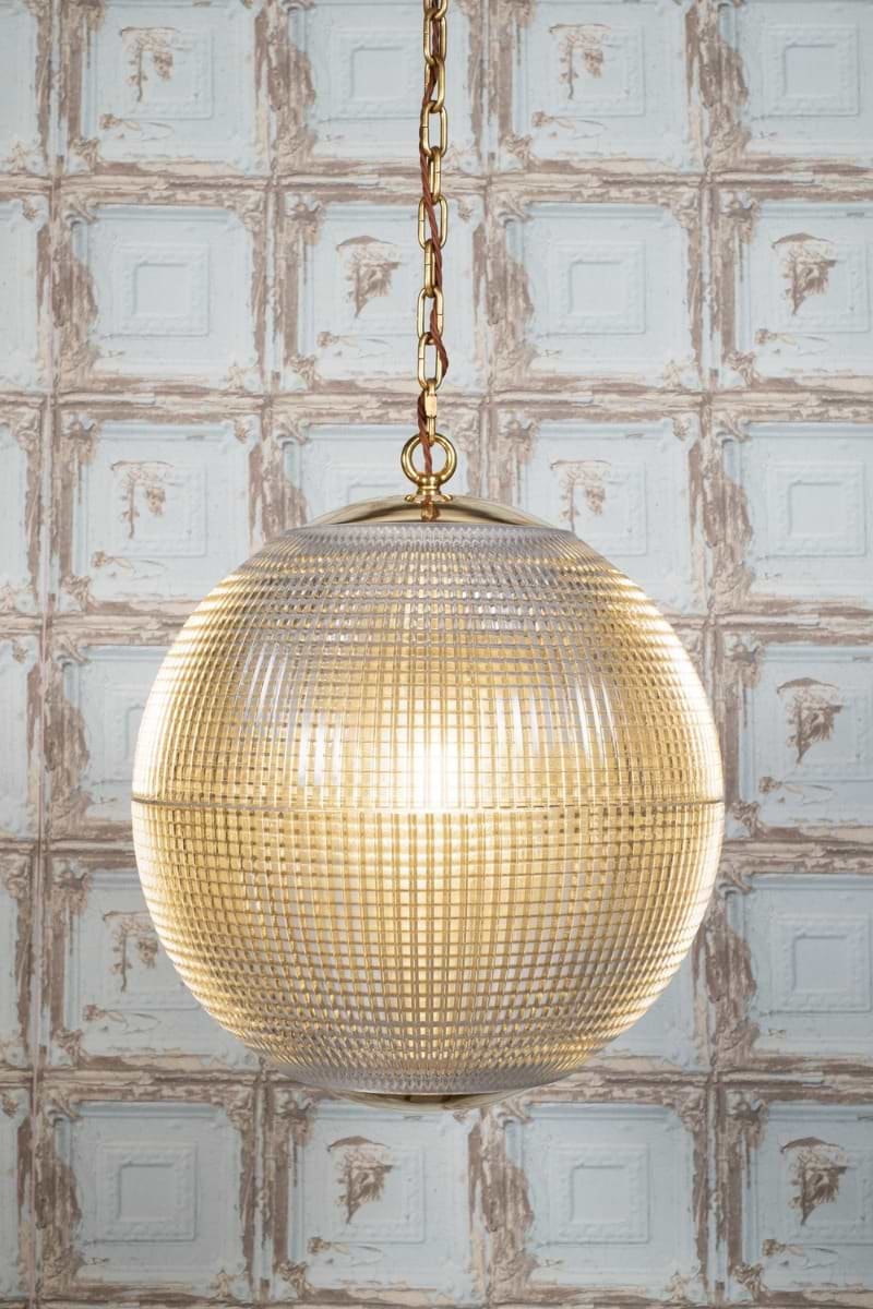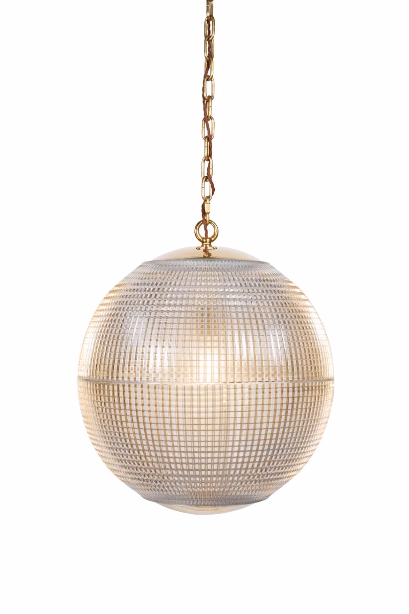 Hollen Globe – ikonické závěsné svítidlo inspirované pařížskými Holophane Globe z 50. let. Texturované prizmatičké sklo a masivní mosazná konstrukce pro rovnoměrné a elegantní osvětlení.