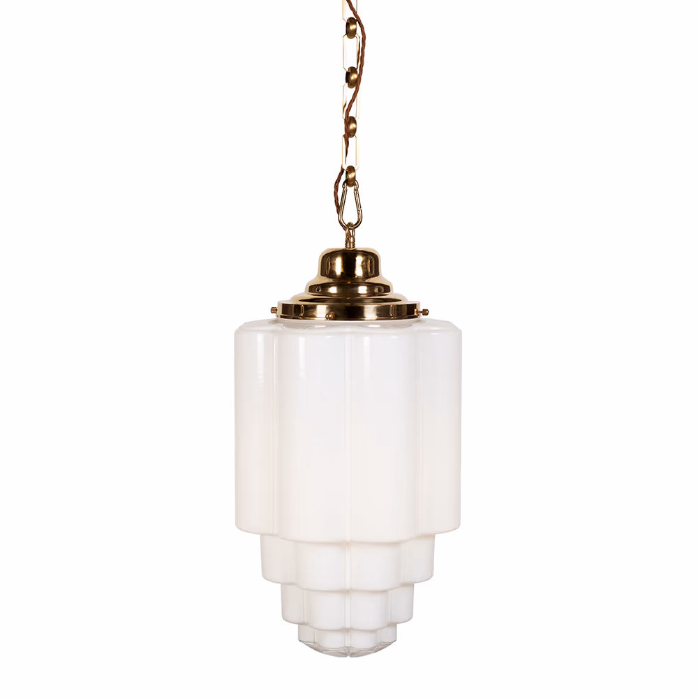 Glasshouse Pendant – závěsné svítidlo z masivní mosazi a kvalitního skla ve variantě opálové. Nadčasový design inspirovaný 20. stoletím v provedení polished brass.