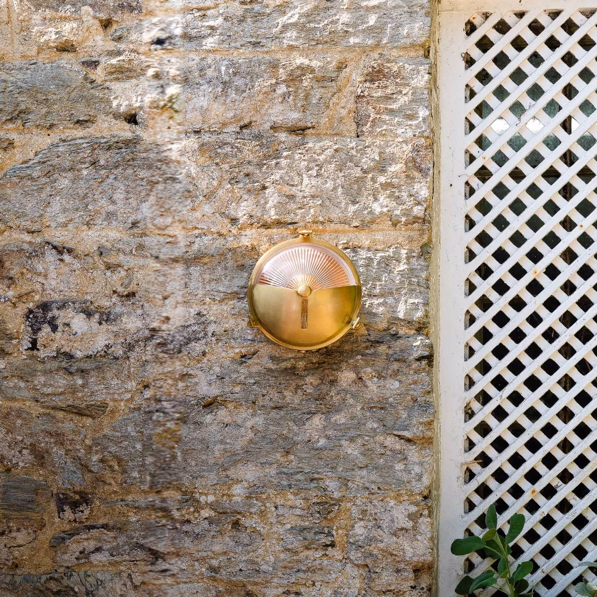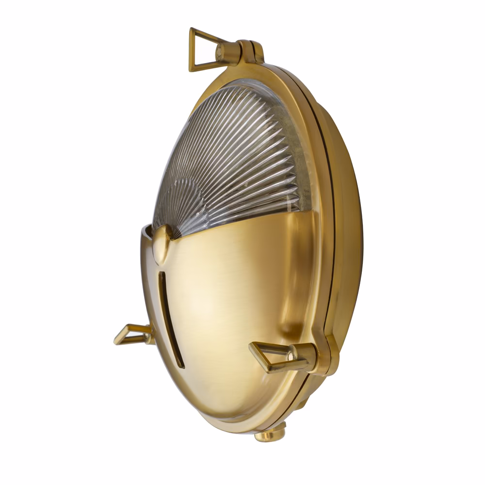 Venkovní bulkhead svítidlo z masivní mosazi s prizmatickým sklem a nastavitelným směrem svícení. Lakovaná starožitná mosaz, odolné a bezúdržbové provedení.